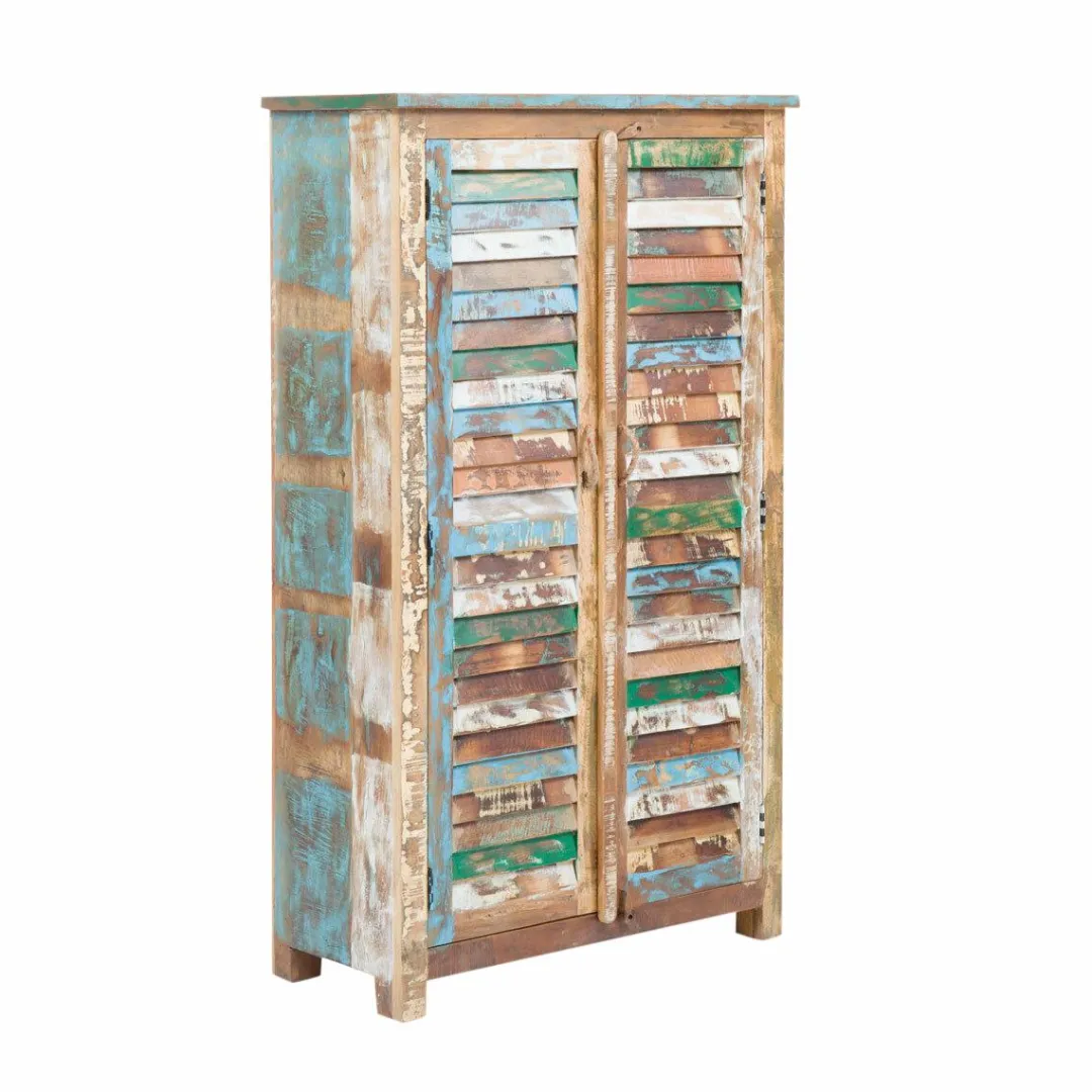 Cette armoire bois massif possède une structure en manguier coloré. Grâce à ses 2 portes à clayettes et ses 3 étagères, elle vous offrira un grand espace de rangement. Cette armoire bois massif très originale, notamment de par ses poignées en métal.