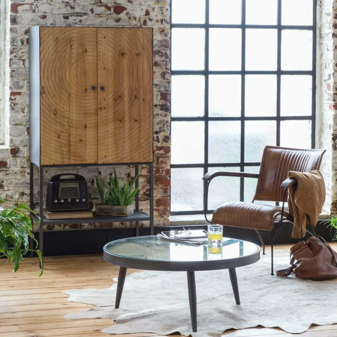 Son plus grand atout ; sans hésiter, son design. Cette armoire industrielle monopolise l’attention grâce à l’effet rondis de bois qu’on retrouve sur les façades des portes. Cette petite touche d’originalité n’est pas seulement visible au regard, elle l’est également au toucher car les façades de portes ne sont pas lisses, on sent une ondulation fidèle aux rondins. Le contour est entièrement en métal gris et on profite du piétement aérien pour retrouver une touche de légèreté.