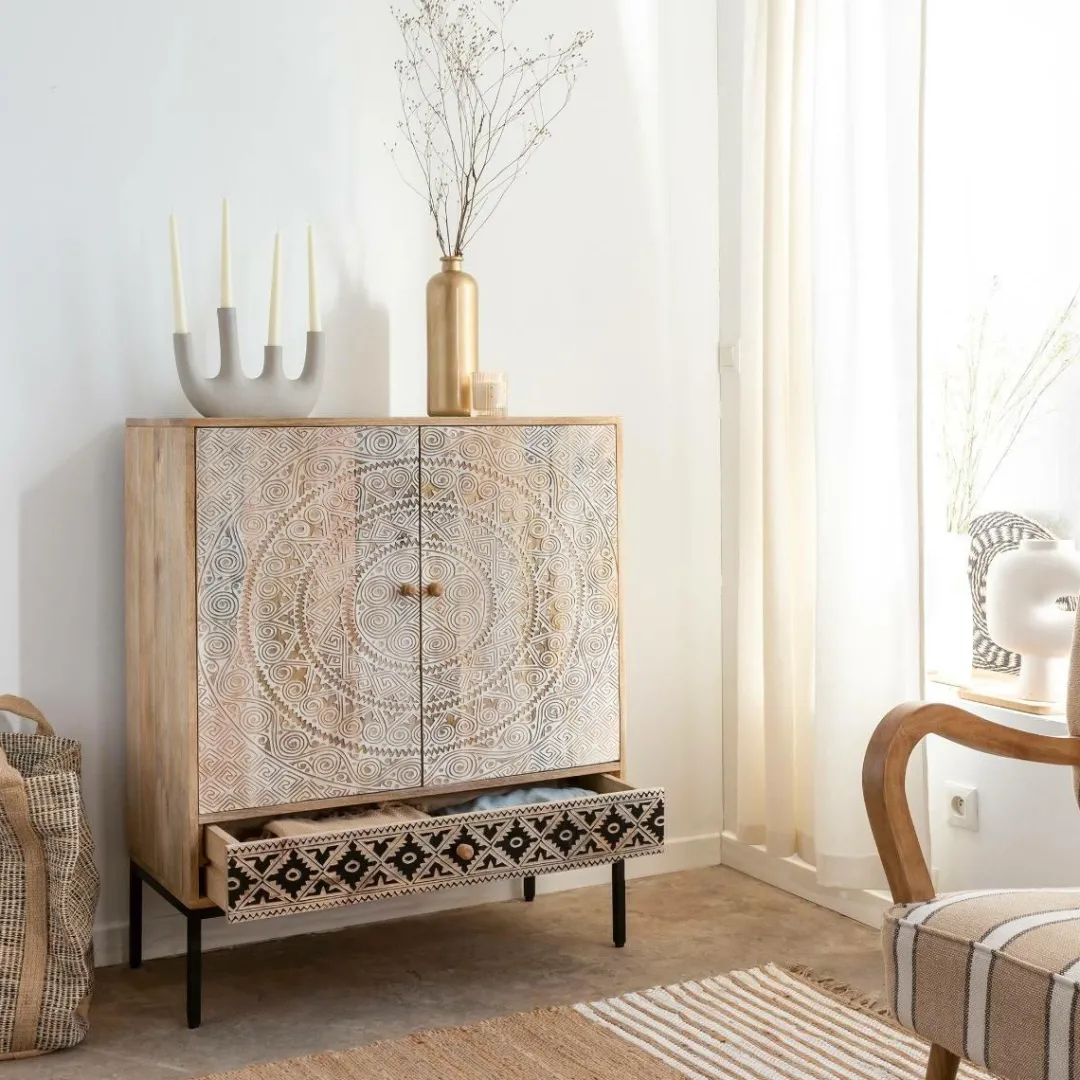 Cette armoire est également dotée d’un grand espace de rangement pratique pour que vos articles restent organisés et bien rangés à l’intérieur. Si vous êtes à la recherche d’une armoire distinctive avec un attrait élégant et une utilisation pratique, l’armoire sculptée en bois de manguier est exactement ce qu’il vous faut !
