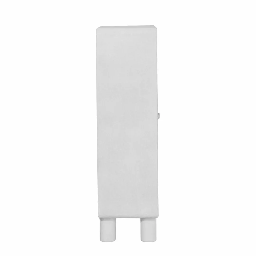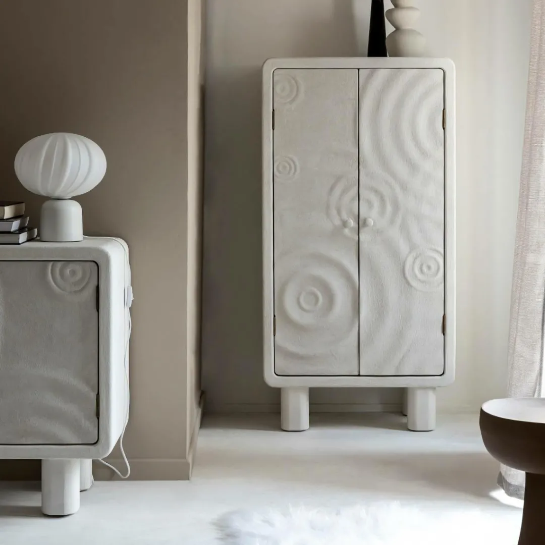Ce buffet de la collection Danaé bouscule les codes du rangement traditionnel avec son esthétique sculpturale et texturée. Entièrement habillé de polyrésine blanche, il séduit par ses formes arrondies et ses motifs en cercles concentriques qui semblent onduler à la surface des portes comme des empreintes dans l’argile.