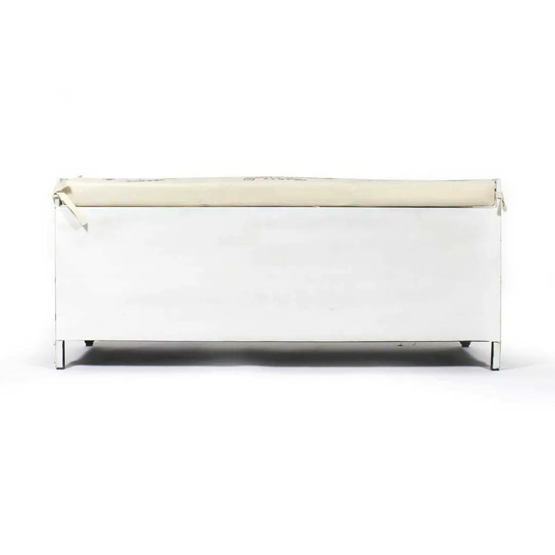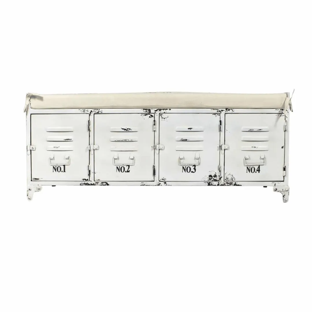 Ce banc bois massif conçu en métal blanc va vous surprendre d’originalité, il allie fièrement le métal qui est un matériau très actuel au traditionnel coussin en tissu. La structure en métal dispose de nombreux détails industriels comme les craquelures au niveau de la peinture, l’aspect casier d’antan, ou encore les loquets en métal.