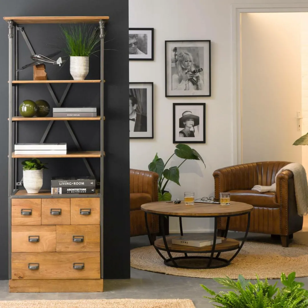 Voici une bibliothèque qui ne vous laissera pas indifférent ! Sa structure en métal noir s’allie parfaitement avec le bois de manguier. Avis aux amateurs de la tendance industrielle, elle ajoutera une touche de fraicheur à votre intérieur. Elle allie charme et authenticité à certains détails complétement dans la tendance actuelle, voilà ce qui fait d’elle une très jolie revisite.