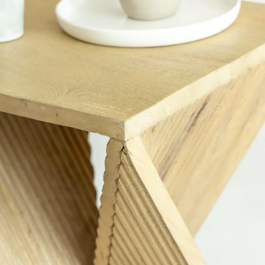 Le bout de canapé Amara en bois de manguier présente une élégante forme sablier.