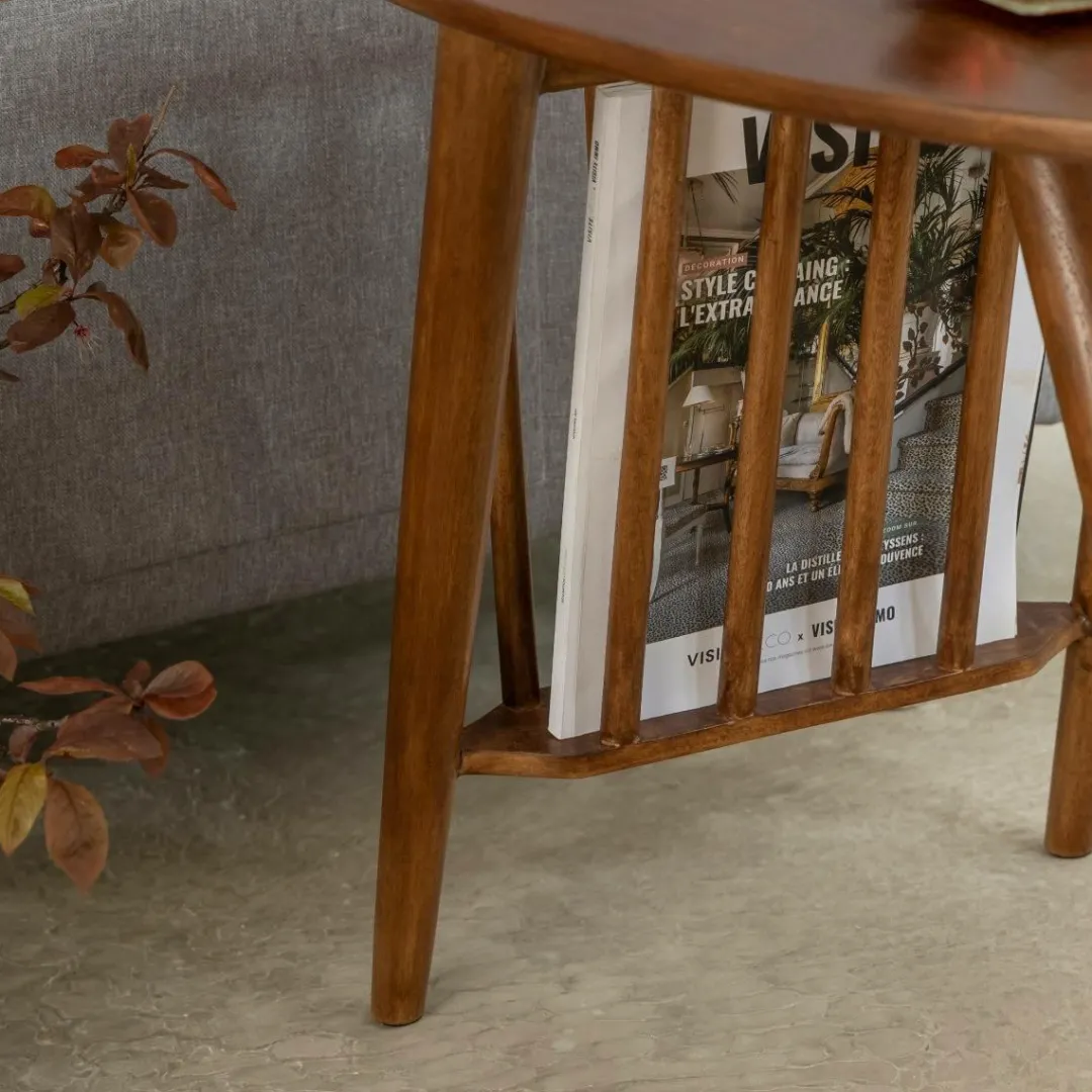 Doté d’un espace de rangement sous forme de porte-revue, ce bout de canapé offre une solution pratique pour organiser vos magazines, livres ou autres petits objets du quotidien. Son plateau ovale ajoute une esthétique élégante et organique à l’ensemble.