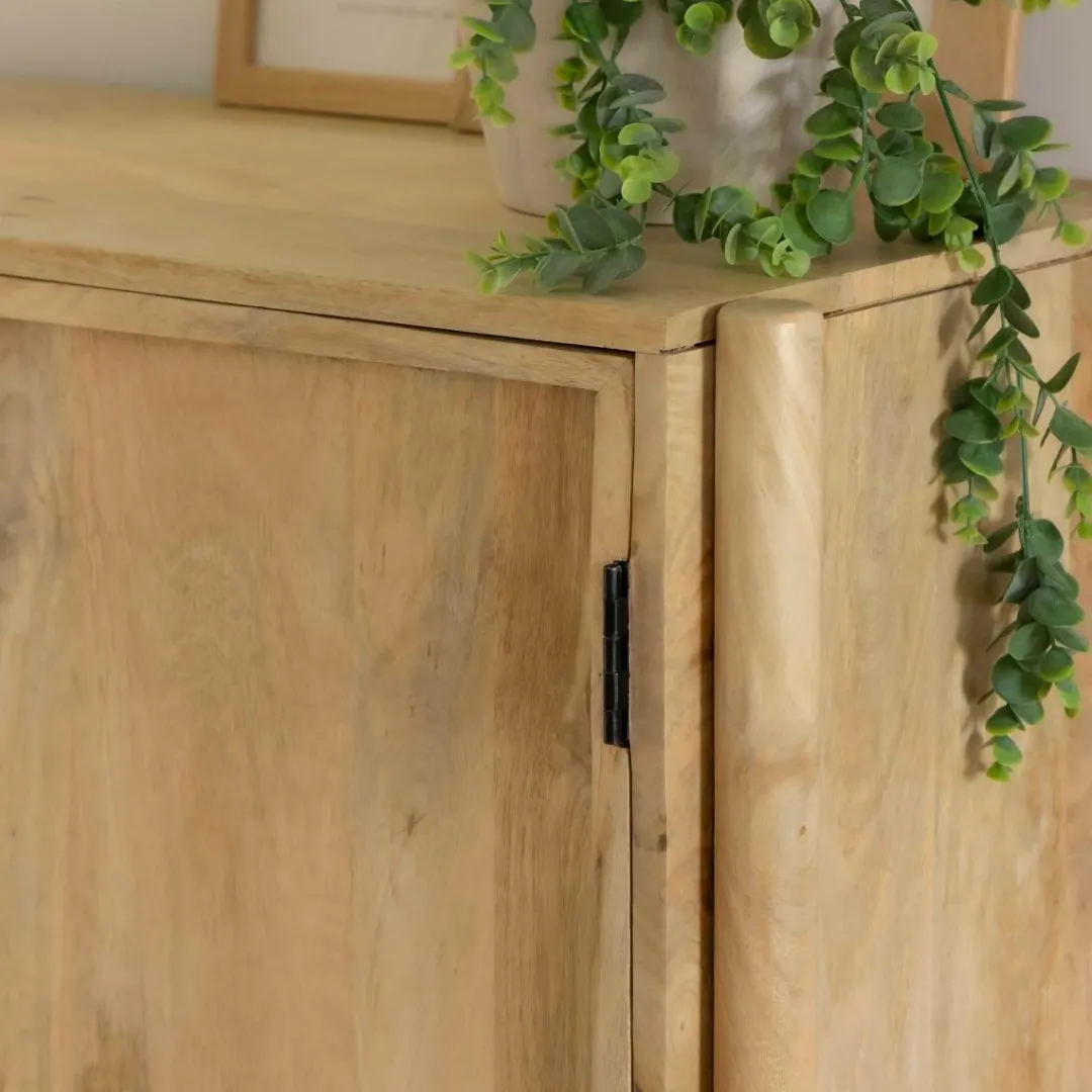 Le Buffet Nova est un meuble raffiné et pratique, fabriqué en bois de manguier de haute qualité. Il est équipé de trois portes, chacune agrémentée de poignées en métal noir, ajoutant une touche contemporaine à son design.