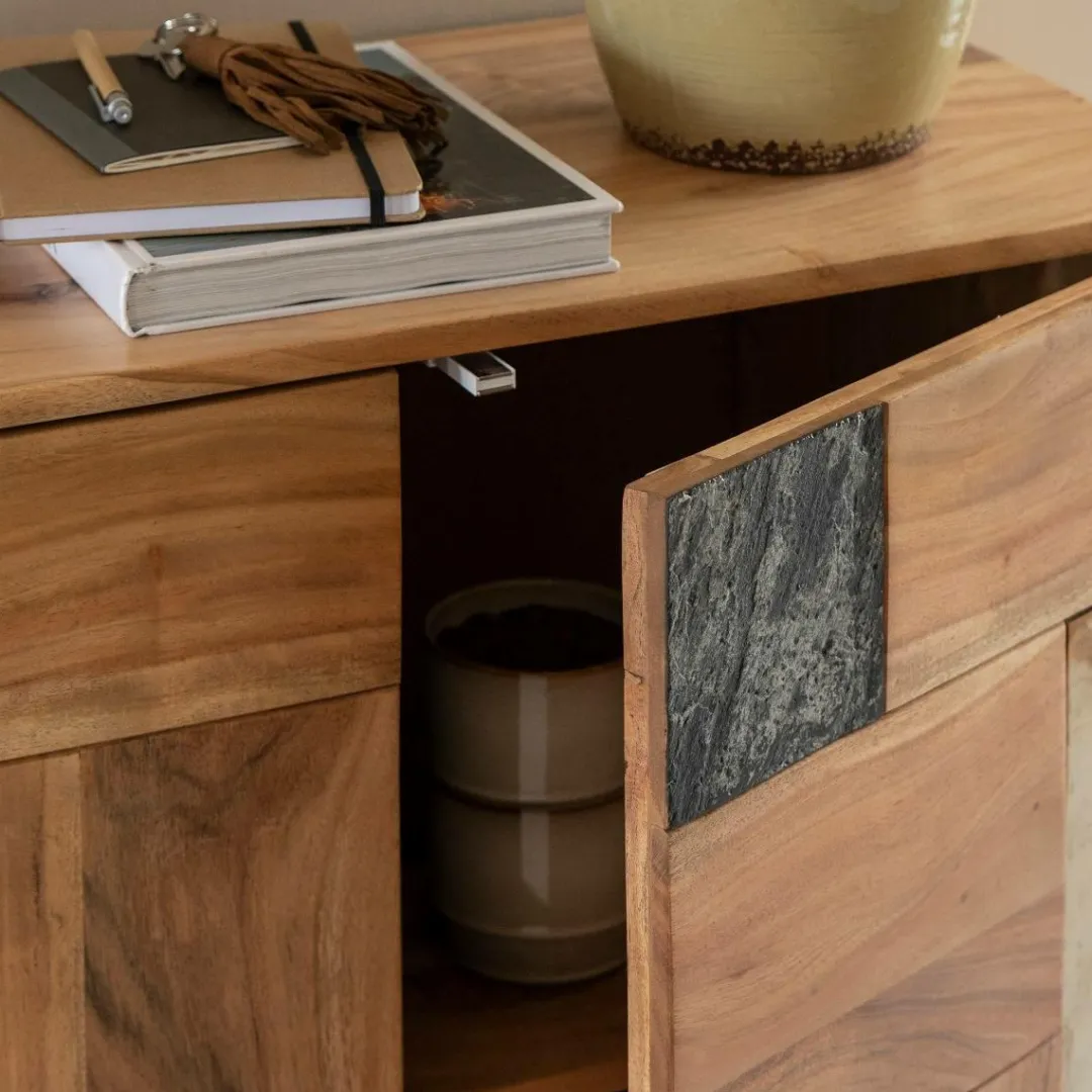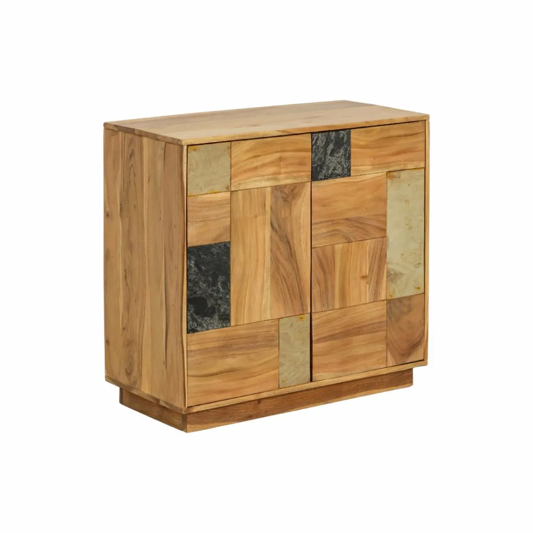 Ce buffet en acacia massif se démarque par son design original en façade patchwork, associant des panneaux de bois aux veinages variés et des touches de teintes minérales pour un rendu graphique et moderne. Chaque élément semble assemblé comme un jeu de matières, créant un effet visuel structuré et dynamique.