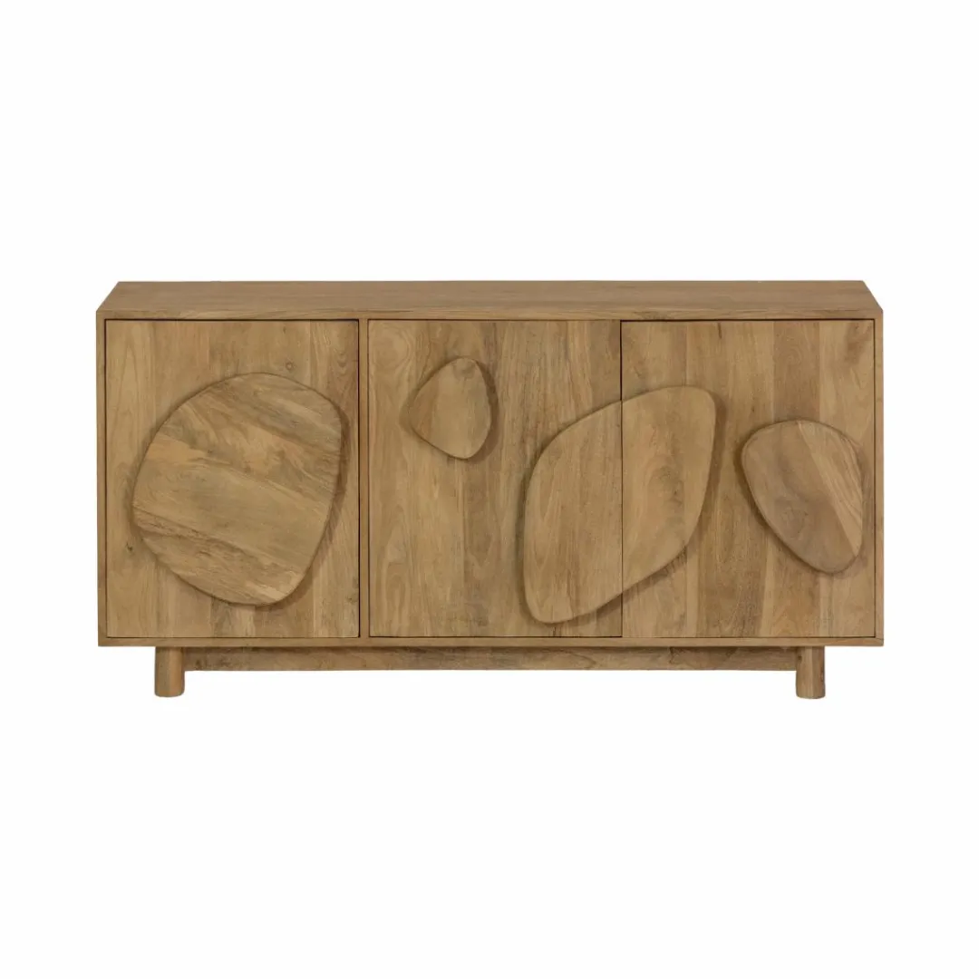 Affirmez votre goût pour le design avec ce buffet en bois de manguier de la collection Aaron. Ce meuble au style sculptural se distingue par ses façades ornées de formes organiques en relief, qui apportent une touche artistique et contemporaine à votre intérieur. Le bois de manguier, avec ses nuances naturelles et chaleureuses, sublime l’ensemble par son aspect brut et authentique.