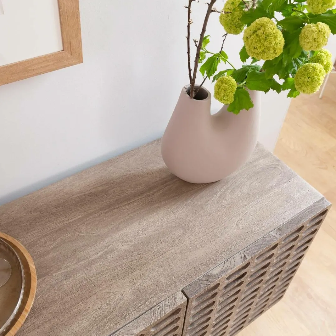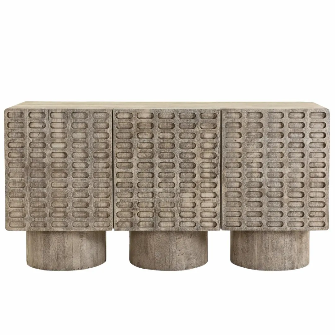 Idéal pour organiser votre salle à manger, le Buffet Clara offre un grand espace de rangement avec trois compartiments dotés de portes sculptées uniques. Gardez tout ce dont vous avez besoin caché derrière ces magnifiques portes tout en utilisant le haut du buffet pour exposer des vases, des photographies ou d’autres bibelots.
