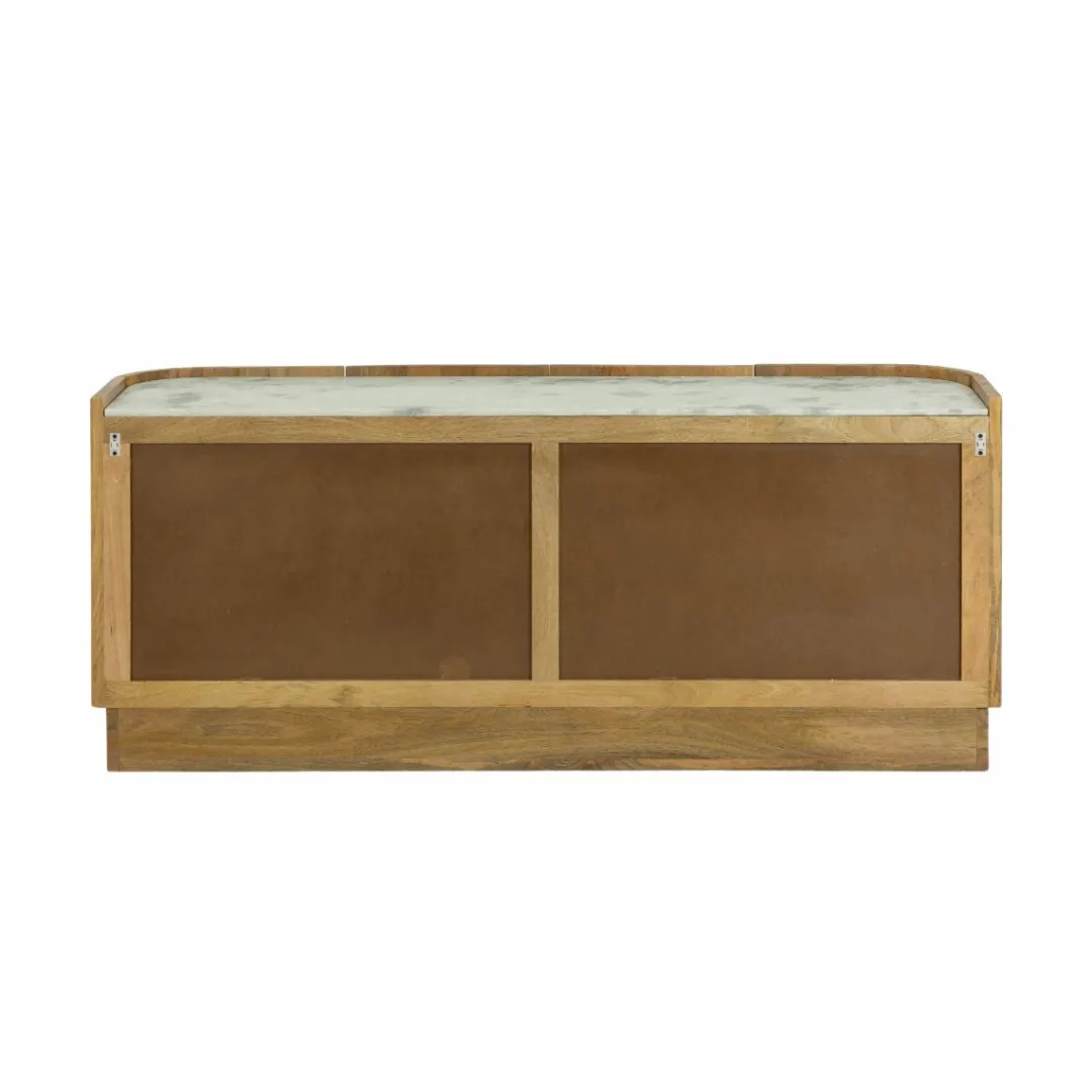 Le corps du meuble est conçu en manguier massif, reconnu pour sa robustesse et son veinage marqué. La silhouette incurvée sur les côtés apporte douceur et modernité, tandis que le marbre blanc veiné, en surface, ajoute une touche minérale précieuse et intemporelle. Derrière ses portes discrètes se cachent des espaces de rangement spacieux, parfaits pour vaisselle, linge de table ou bouteilles.