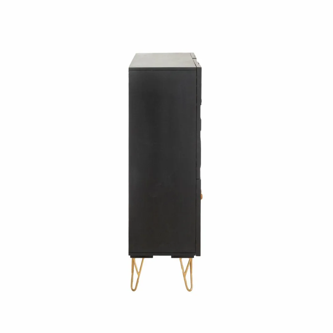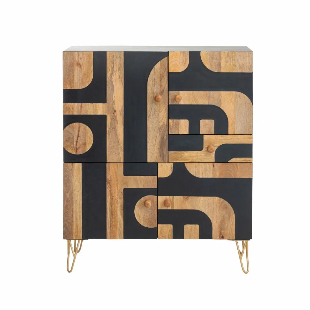 Avec une hauteur de 120 cm et une largeur de 100 cm, il offre cinq espaces de rangement distincts derrière des portes ornées de charmants motifs géométriques noirs. Son design contemporain et élégant en fait le complément idéal pour améliorer votre décoration intérieure et ajouter de la sophistication à n’importe quel espace.