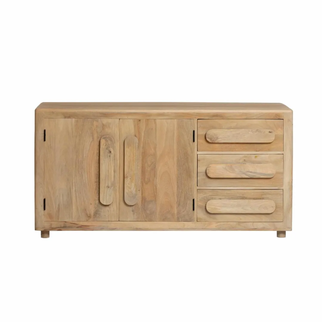 Le buffet Kael incarne l’élégance et la fonctionnalité dans un design sophistiqué en bois de manguier. Doté de deux portes et de trois tiroirs spacieux, il offre un espace de rangement généreux pour organiser vos objets avec style.