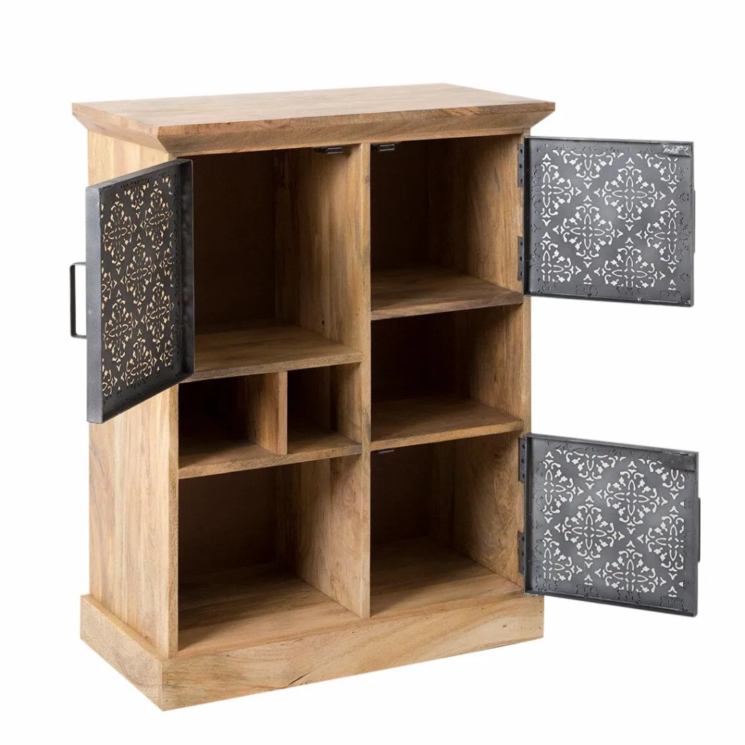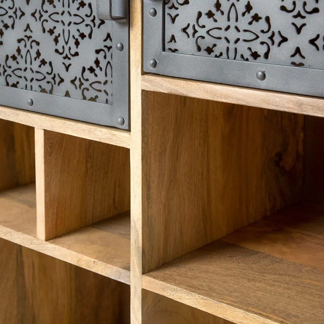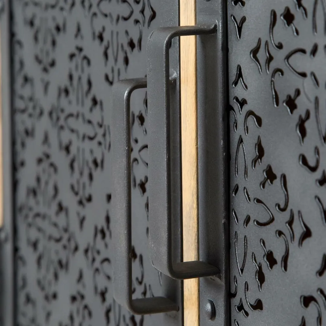 Ce buffet dispose d’un design bi-matière qui est très bien équilibré. Il allie le bois de manguier qui est un bois très lumineux au métal gris. Le métal est ajouré de façon à simplifier et alléger les traits parfois trop durs de ce matériau. On aime son design sublimé par de jolis motifs. Le choix des matériaux et des coloris est très bien dosé et harmonise l’ensemble du meuble.
