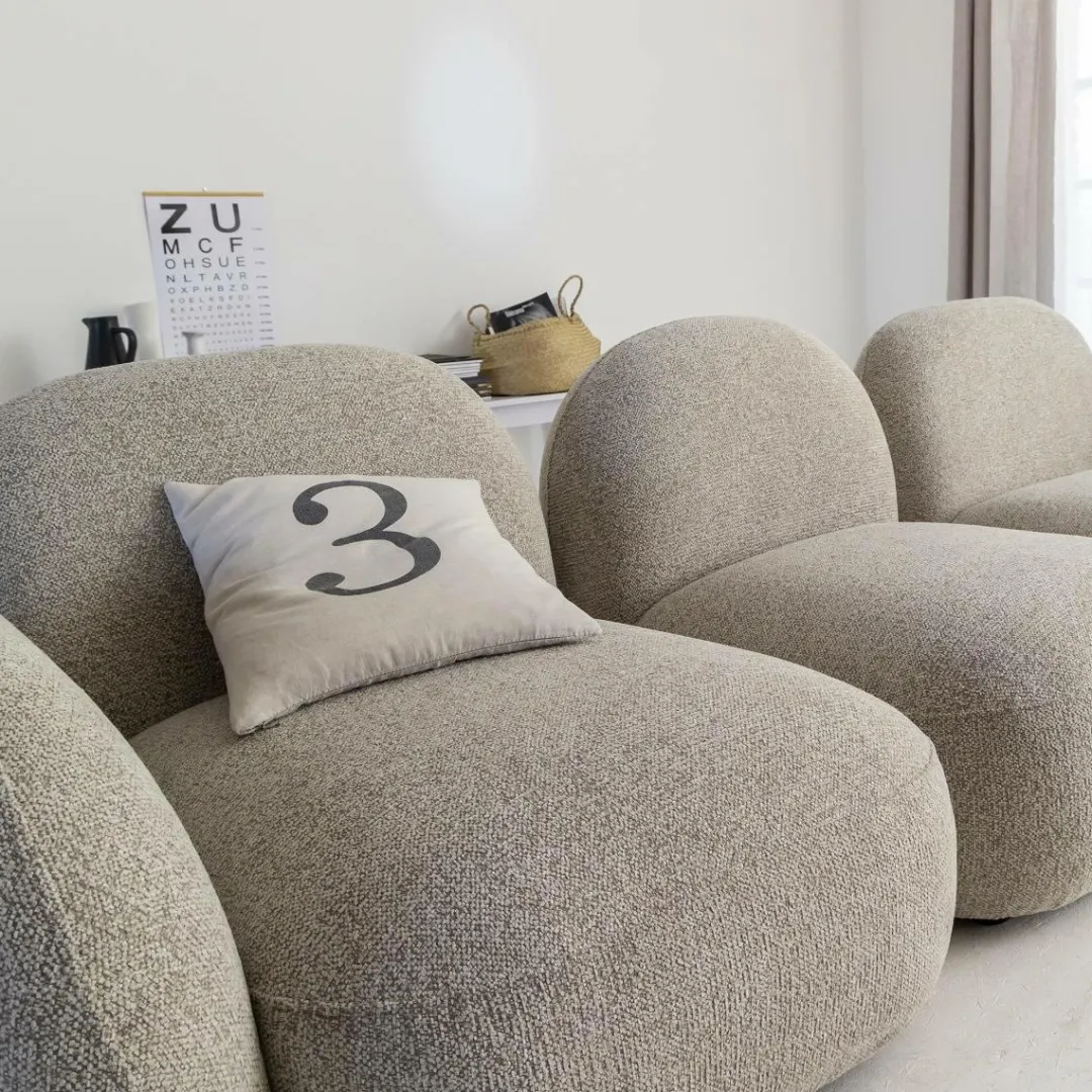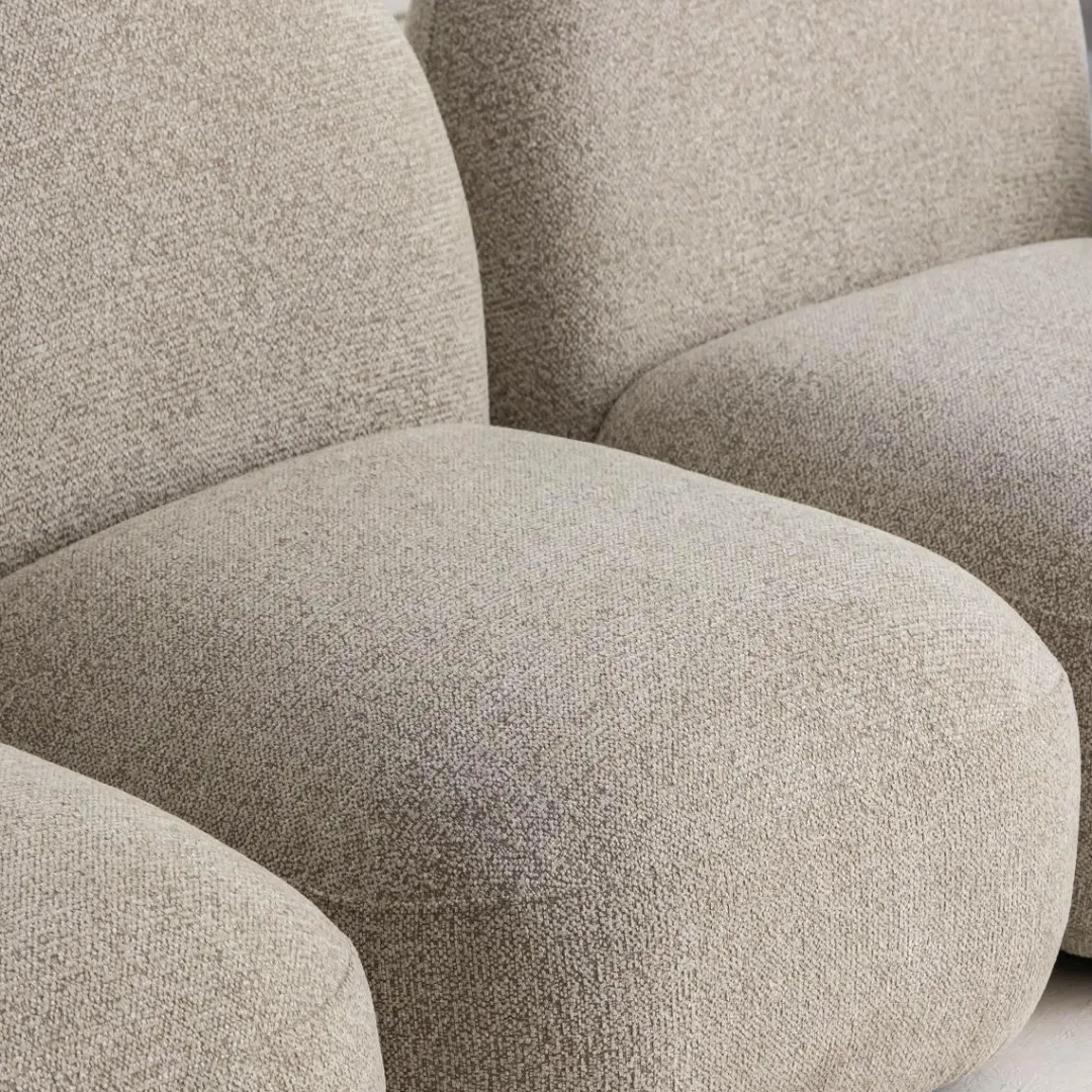 Les trois modules indépendants permettent une configuration personnalisable selon vos envies et la disposition de votre pièce. Idéal pour un salon moderne ou scandinave, le Calya séduit par son look cocooning et son assise généreuse. Son tissu bouclette gris clair s’intègre facilement à tous types de décoration.