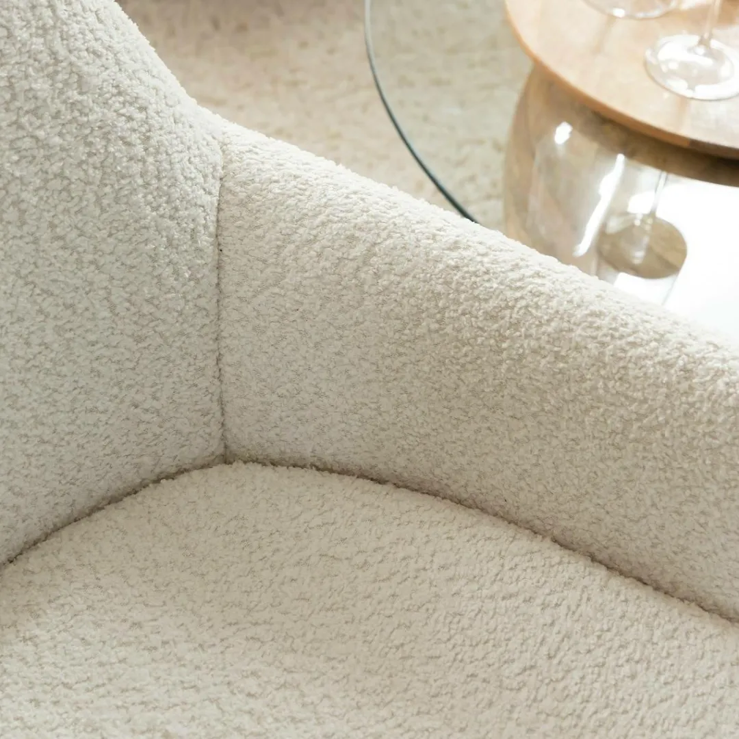 Le canapé Amandine, avec son revêtement en tissu bouclette blanc et sa structure en métal noir, combine parfaitement confort et style.