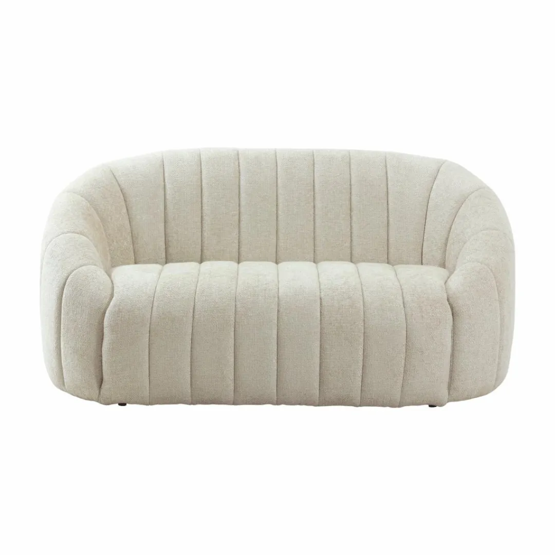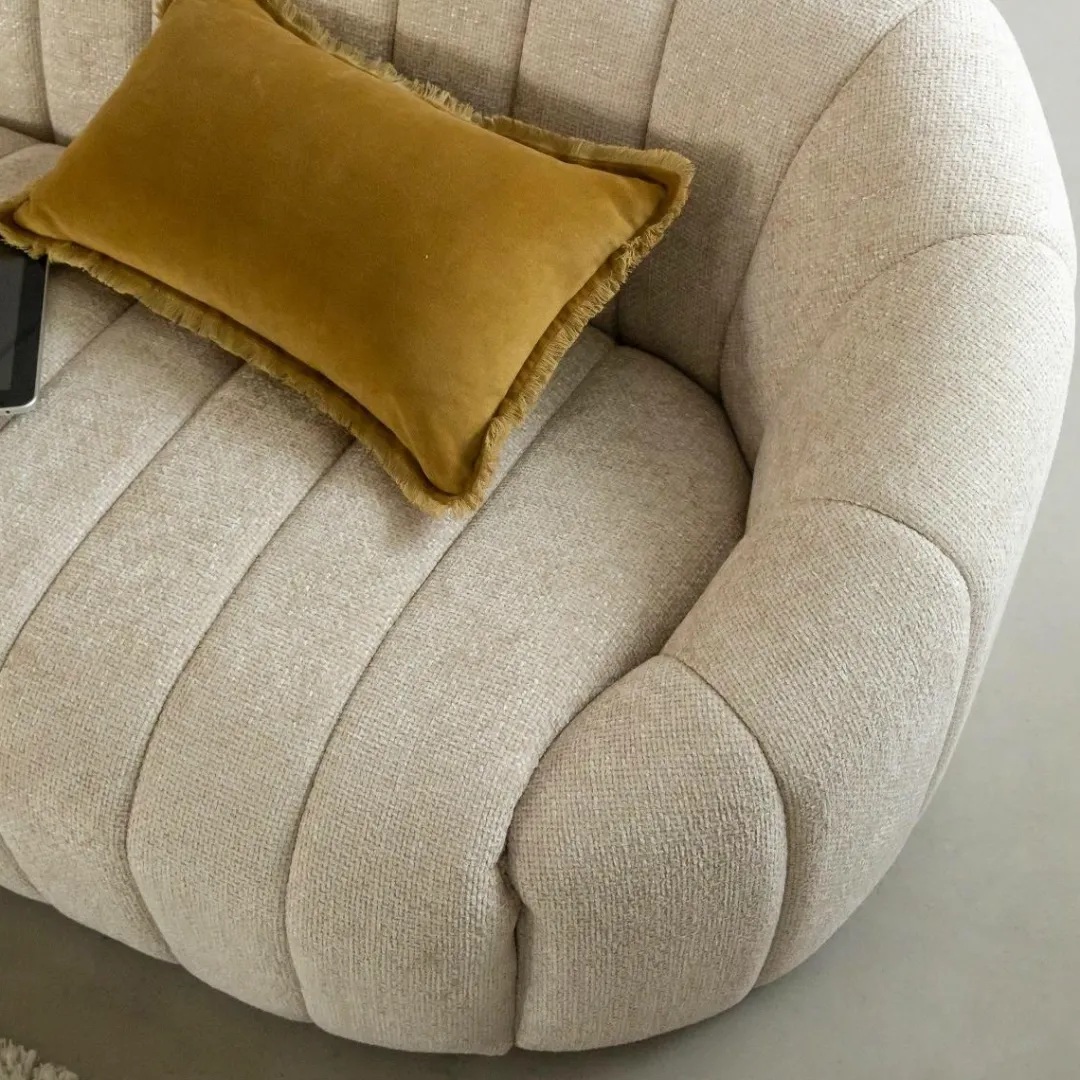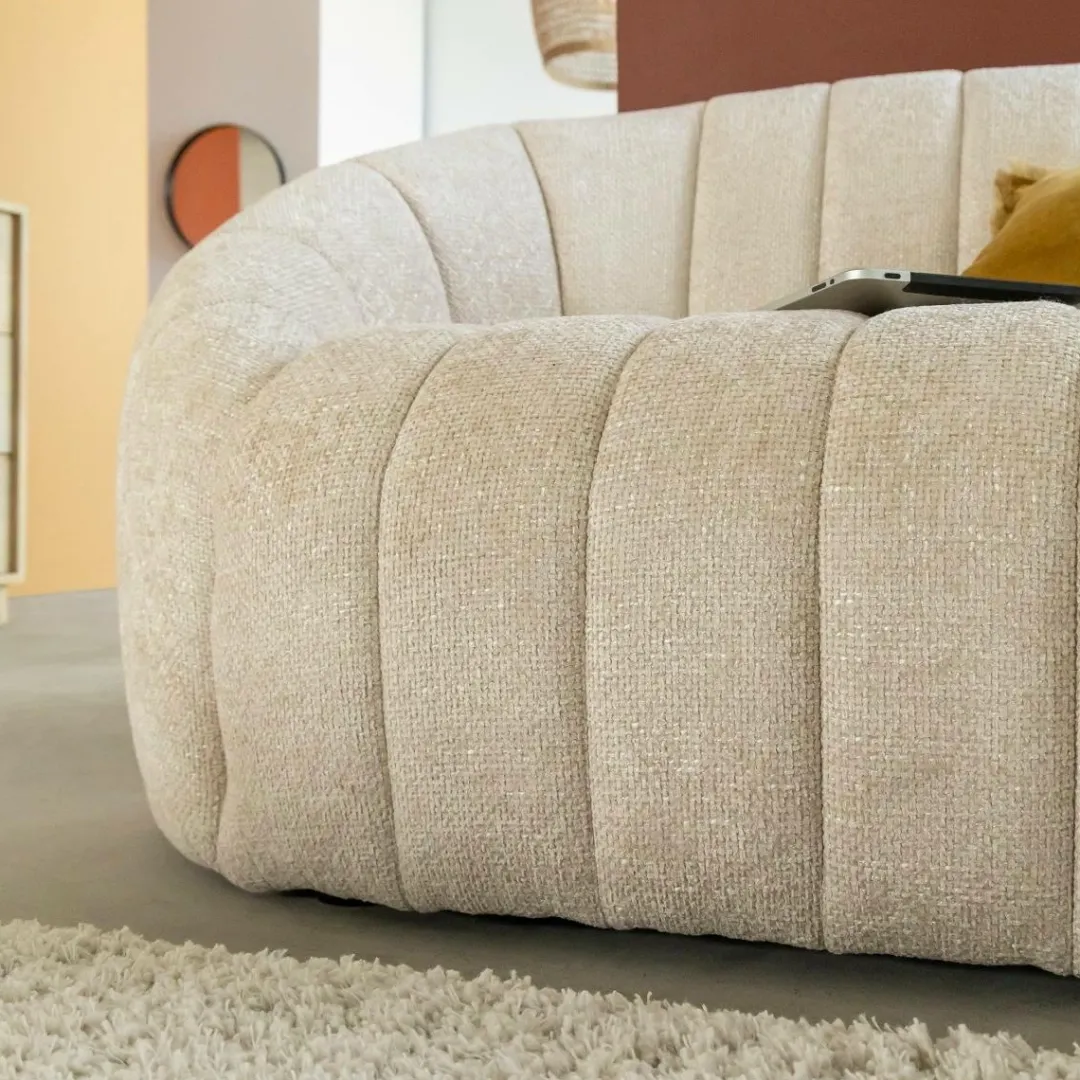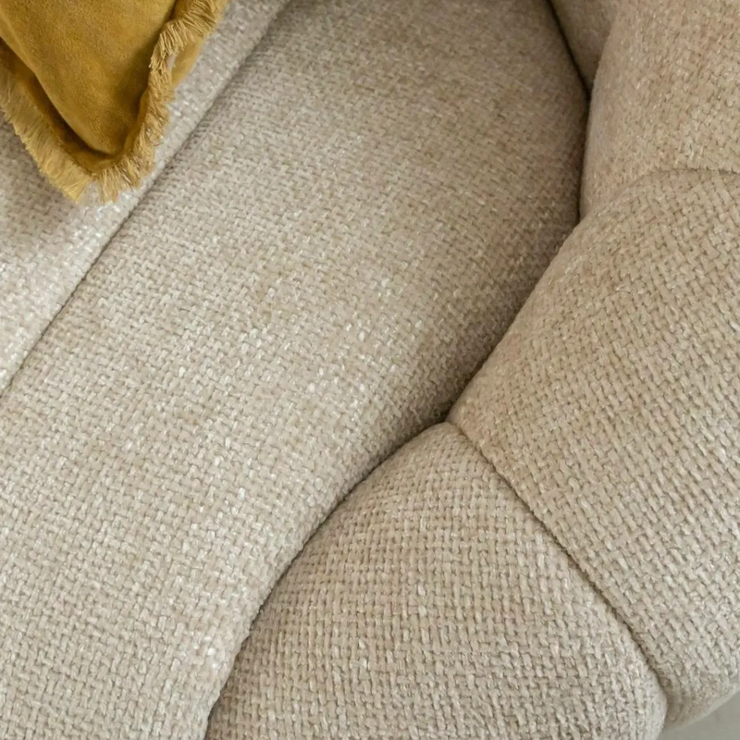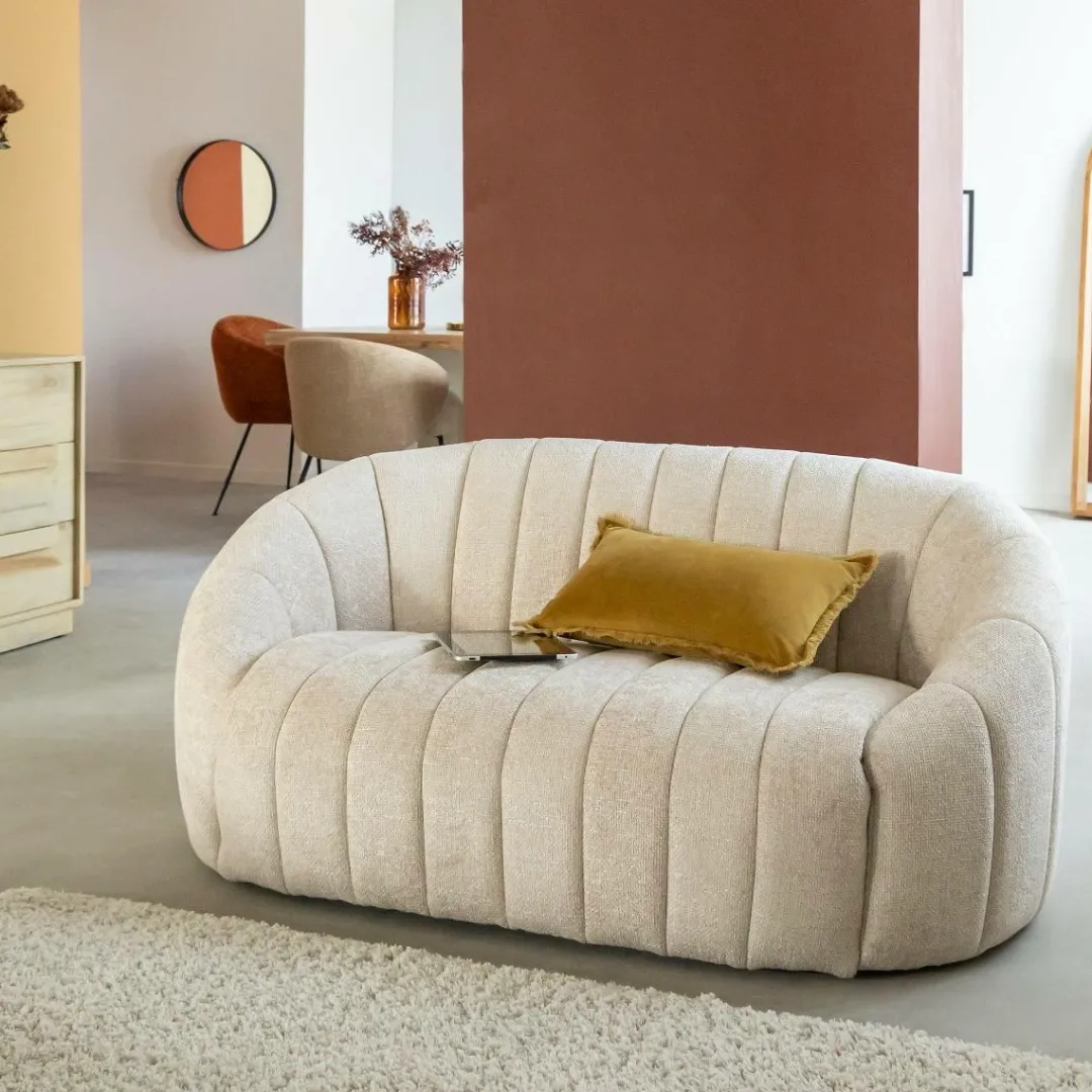 Ce canapé en tissu écru séduit par ses lignes douces et son design contemporain. Son revêtement au toucher agréable et sa teinte neutre apportent luminosité et élégance à votre intérieur. Avec sa forme arrondie et ses coutures verticales, il combine confort et esthétique pour créer une ambiance chaleureuse et raffinée dans le salon.
