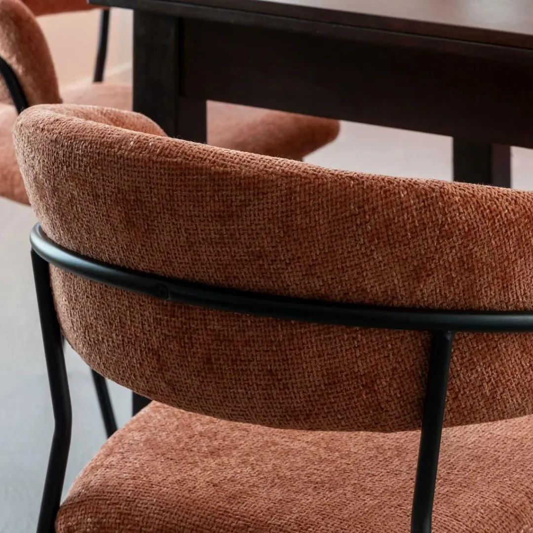 Cette chaise allie confort et modernité avec un design élégant et des finitions soignées. Son revêtement en tissu terracotta apporte une touche chaleureuse et tendance, parfaite pour dynamiser votre intérieur. Son dossier courbé et son assise moelleuse offrent un excellent confort, tandis que ses pieds fins en métal noir assurent stabilité et légèreté visuelle.