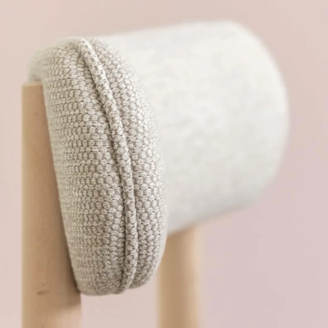 Sa structure en hêtre massif, légèrement teinté naturel, met en valeur la finesse du bois tout en assurant une solidité durable. Le piètement cylindrique apporte une touche de modernité, tandis que l’assise et le dossier rembourrés offrent un confort appréciable au quotidien. Le tissu beige, subtilement texturé, renforce l’aspect chaleureux et lumineux de la pièce.