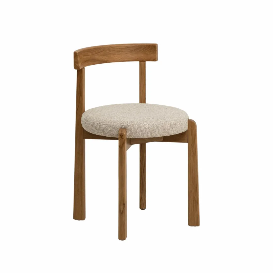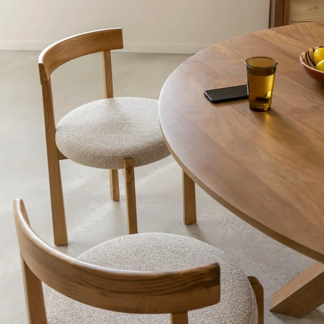 La structure en chêne massif met en valeur le veinage du bois et confère une solidité à toute épreuve. L’assise circulaire, généreusement rembourrée et recouverte d’un tissu bouclette clair, crée un contraste élégant avec les lignes anguleuses du piètement. Son dossier en demi-lune en bois massif apporte un excellent maintien et une vraie originalité visuelle.