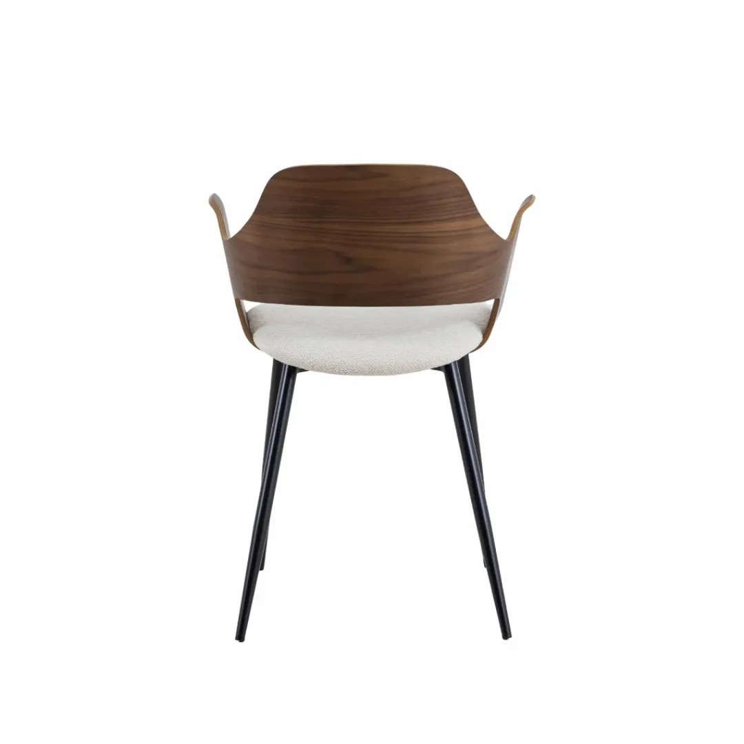 Cette chaise de la collection Florence se distingue par son caractère affirmé et son design élégant. Son dossier en bois triplex foncé apporte une touche sophistiquée et chaleureuse, créant un contraste subtil avec l’assise en tissu écru, à la fois douce et confortable. Ses accoudoirs intégrés renforcent son allure enveloppante et offrent une assise agréable au quotidien.