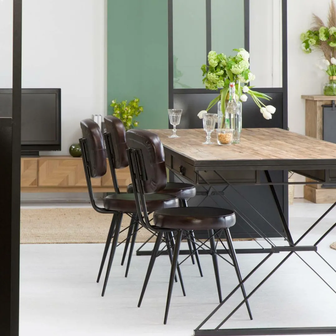 Cette chaise industrielle vendue par lot de deux est réalisée à partir de matériaux de qualité à savoir du cuir marron foncé pour son assise, ainsi que du métal noir pour son piétement. Son atout déco ? Sans aucun doute, son design ! On adore son assise ronde et son dossier rectangulaire qui apporteront un confort indéniable. Coup de coeur pour son piétement Eiffel qui amène l’esprit tendance et original à l’ensemble de ce lot de chaises.