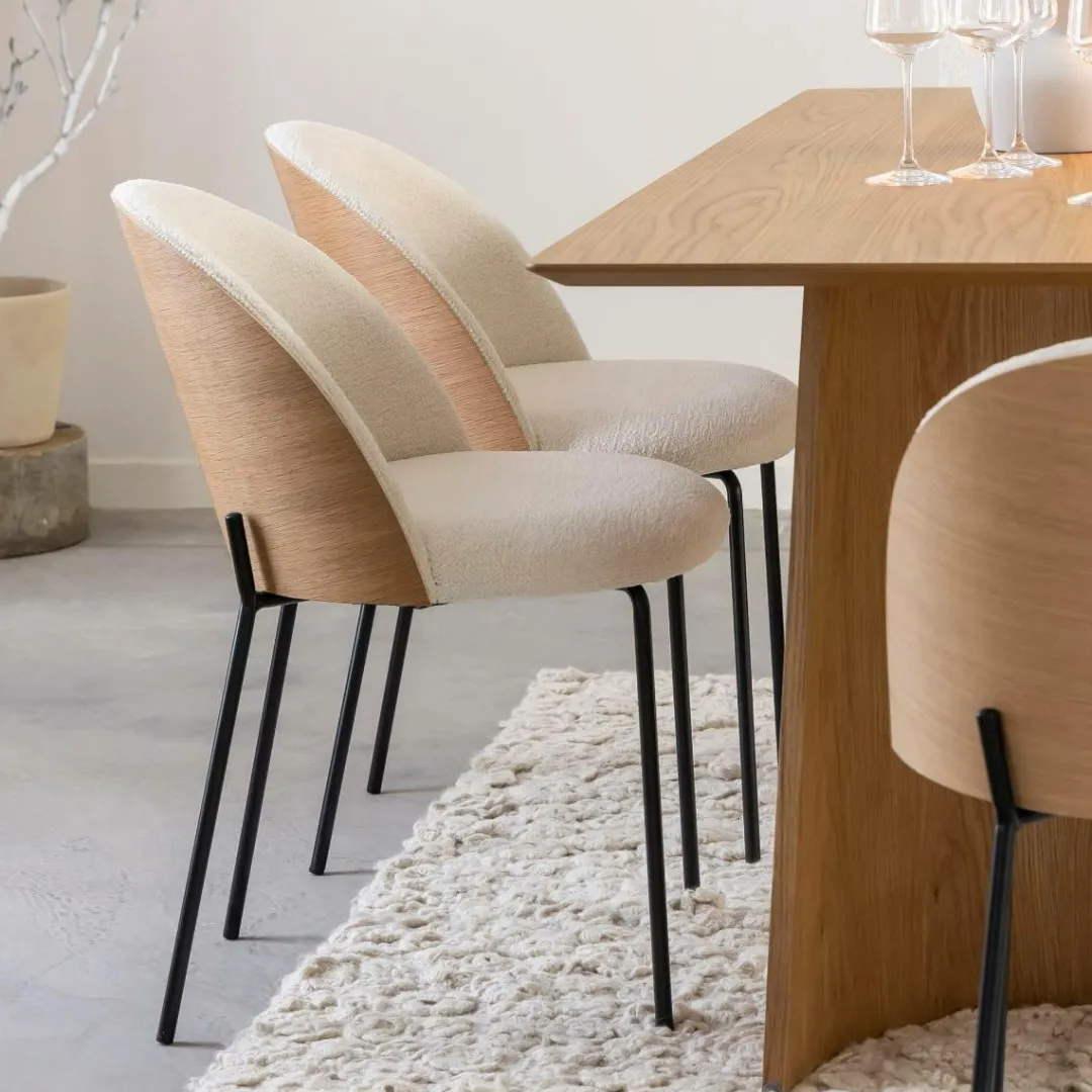 Son assise et son dossier sont revêtus d’un tissu bouclette écru clair, offrant une texture douce et chaleureuse. Le dos de la chaise est sublimé par un panneau en placage bois clair, apportant une touche naturelle et raffinée.