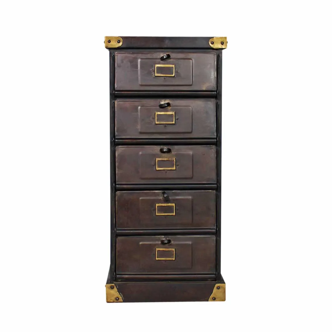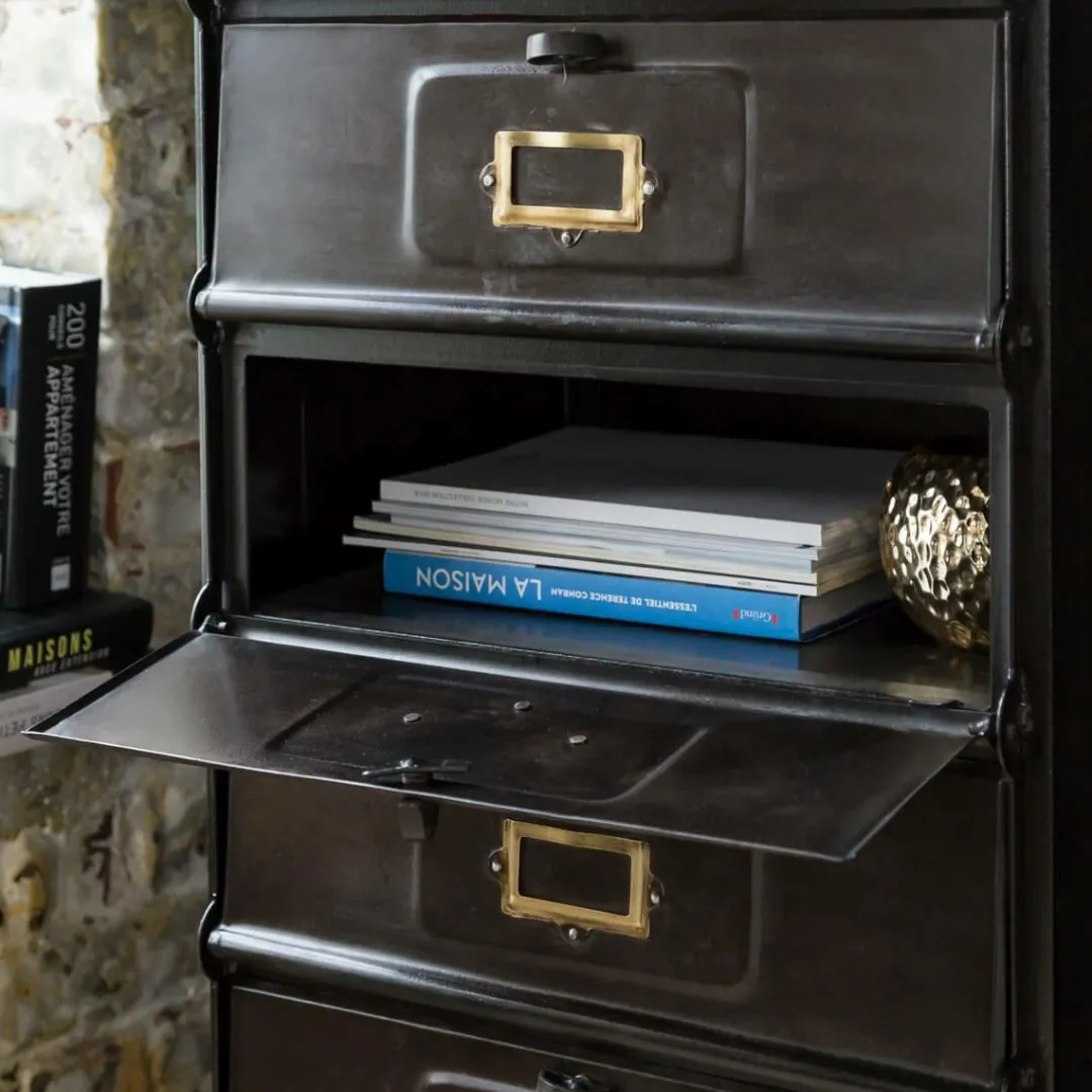 D’une hauteur de 1 mètre, ce chiffonnier industriel de style vintage est composé de métal noir, avec finitions dorées. Son originalité réside dans le système d’ouverture à trappes et dans le design rétro. Ses 5 trappes vous offriront de nombreuses possibilités de rangements. Bouquins, classeurs, documents, ce chiffonnier industriel va vous simplifier la vie !