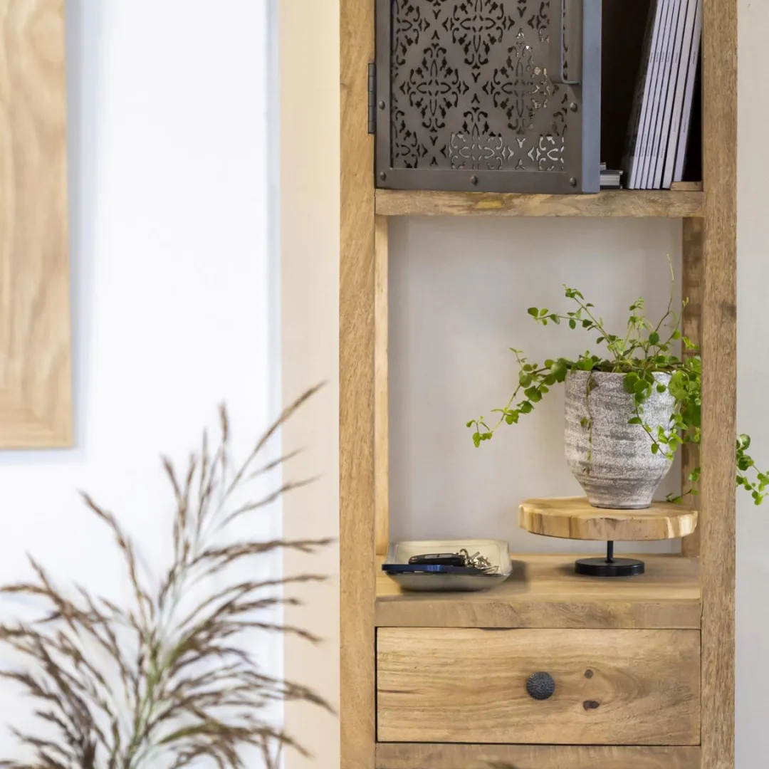 Passons aux présentations. Cette colonne vous propose de décorer tout en stockant. Les deux espaces de stockage cachés derrière les portes et le tiroir vous permettront de stocker. La niche, quant à elle, a été pensée afin d’apporter une petite note déco, vous pourrez déposer un bouquet de fleurs séchées, un diffuseur de parfum, des plantes…