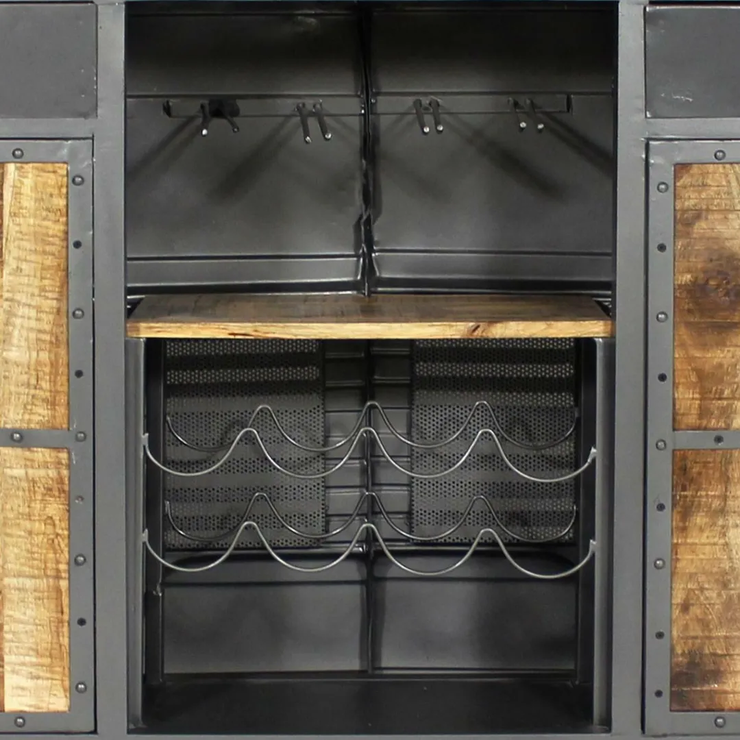 Ce bar industriel qui allie esthétisme et fonctionnalité est doté de nombreux rangements. Vous pourrez stocker aisément vos bouteilles ainsi que vos verres de collection grâce à ses portes bouteilles et portes verres. Vous apprécierez également ses deux tiroirs, son étagère et enfin ses deux généreux espaces de stockage cachés par deux portes pleines.