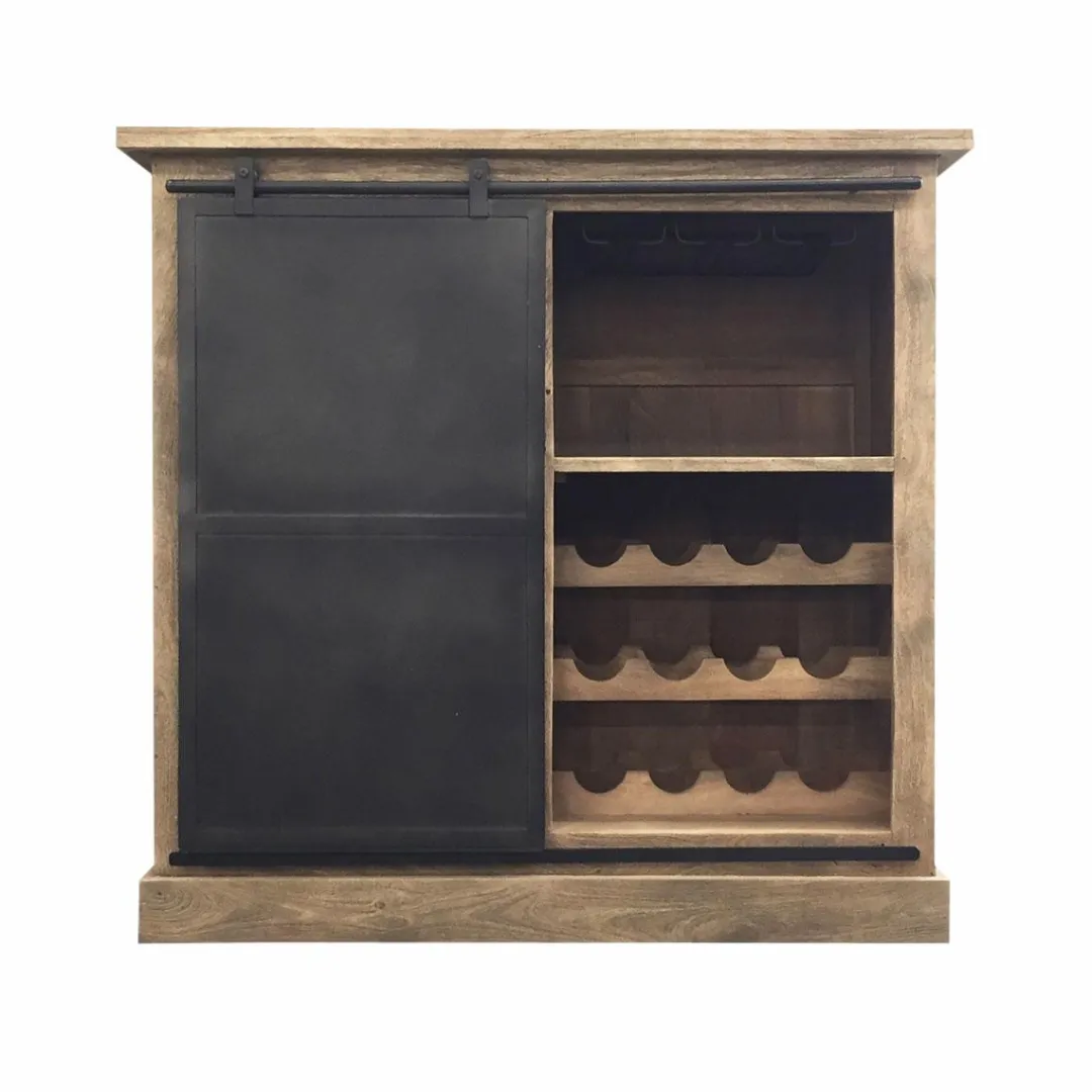 Son petit plus, l’originalité de sa porte coulissante qui apporte autant au design du meuble qu’à sa praticité. Il combine différents moyens de stockage afin de faciliter votre rangement. Derrière sa porte se trouve 2 niches capables de stocker des bouteilles ou de la vaisselle. Sur la partie gauche, on trouve 3 rails qui supporteront vos verres suspendus ainsi que 3 rangées pour disposer 12 bouteilles.