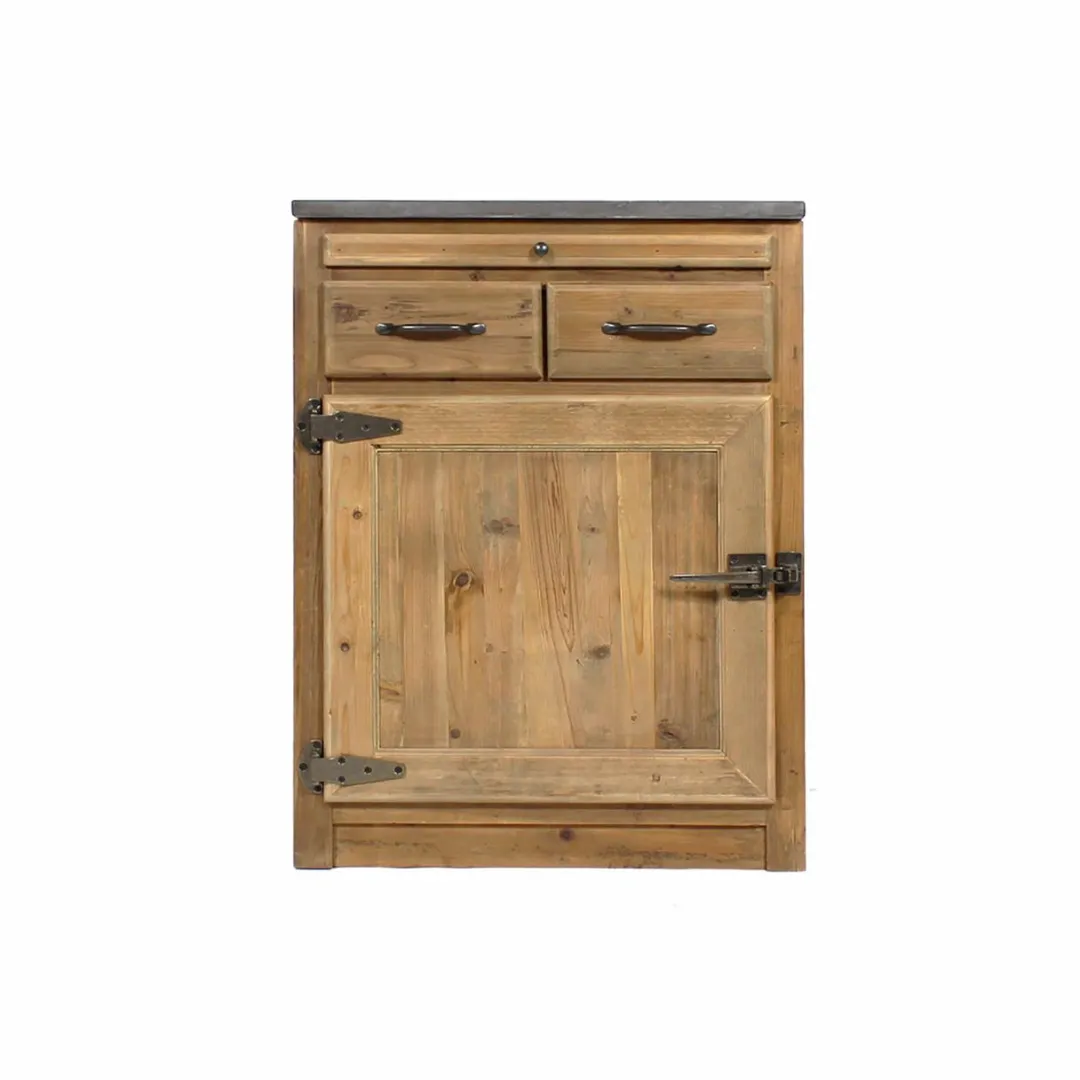 Ce meuble de cuisine est bourré de charme et d’authenticité ! L’alliance entre le bois recyclé, le métal et la pierre bleue naturelle de Chine apporte une touche de modernité à l’ensemble du meuble tout en conservant le cachet d’antan que l’on aime tant. Les nuances claires du vieux pin lui permettront de s’intégrer aisément dans votre intérieur. Faites de votre cuisine un lieu chaleureux où il sera bon de rassembler votre famille !