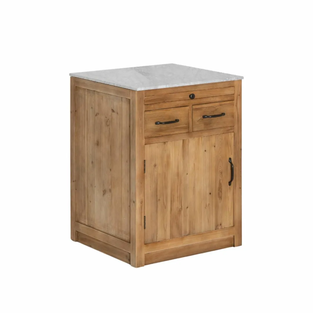Ce meuble de cuisine séduit par son authenticité et son charme indéniable. Le mariage subtil du bois recyclé, du métal et du marbre lui confère un style à la fois moderne et empreint de caractère. Avec ses teintes claires de vieux pin, il s’intègre facilement dans tous les types d’intérieurs, apportant chaleur et convivialité à votre pièce. Créez un espace où il fait bon cuisiner et partager en famille !