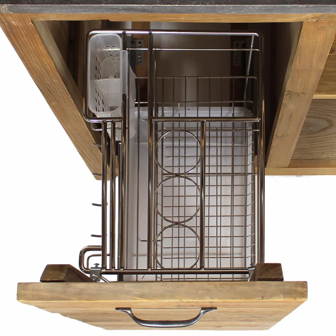 Ce meuble de cuisine est bourré de charme et d’authenticité ! L’alliance entre le bois recyclé, le métal gris et la pierre bleue de Chine apporte une touche de modernité à l’ensemble du meuble tout en conservant le cachet d’antan que l’on aime tant. Les nuances claires du vieux pin lui permettront de s’intégrer aisément dans votre intérieur. Faites de votre cuisine un lieu chaleureux où il sera bon de rassembler votre famille !