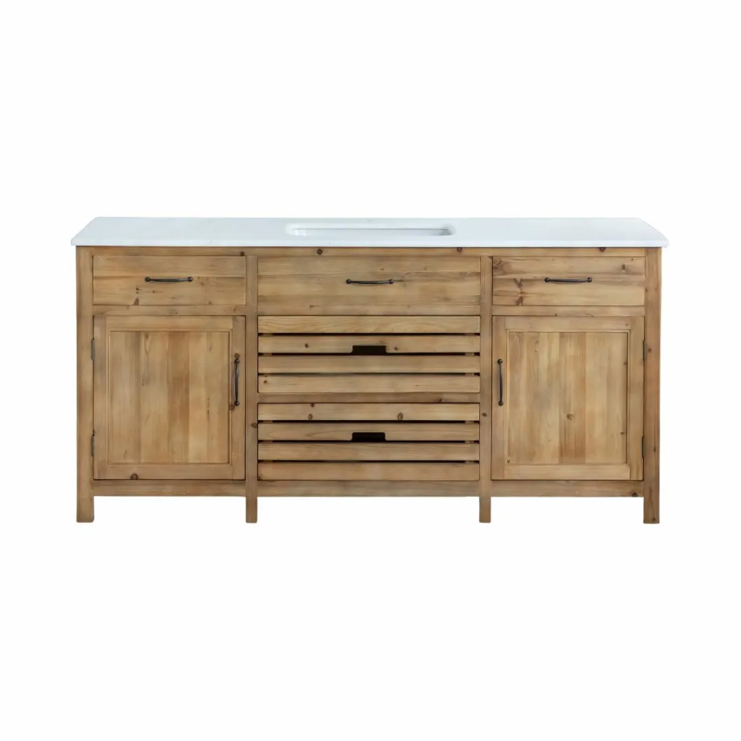 Ce meuble de cuisine en pin recyclé avec plateau en marbre blanc conjugue esthétique rustique et fonctionnalité contemporaine. Conçu comme un meuble bas de cuisine, il offre un espace de travail élégant grâce à son plan en véritable marbre, parfait pour préparer les repas tout en apportant du cachet à votre pièce.