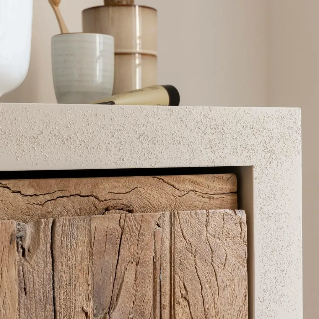 Compact et design, ce meuble sous vasque de la collection Dalva joue sur les contrastes pour offrir un style affirmé et contemporain. Sa structure en bois d’ingénierie effet béton lui donne une allure brute et résolument moderne, tandis que ses portes en bois recyclé insufflent une chaleur naturelle et une authenticité unique. Le veinage apparent du bois, mis en valeur par une finition sobre, vient adoucir l’aspect minéral du béton pour créer un équilibre visuel harmonieux.