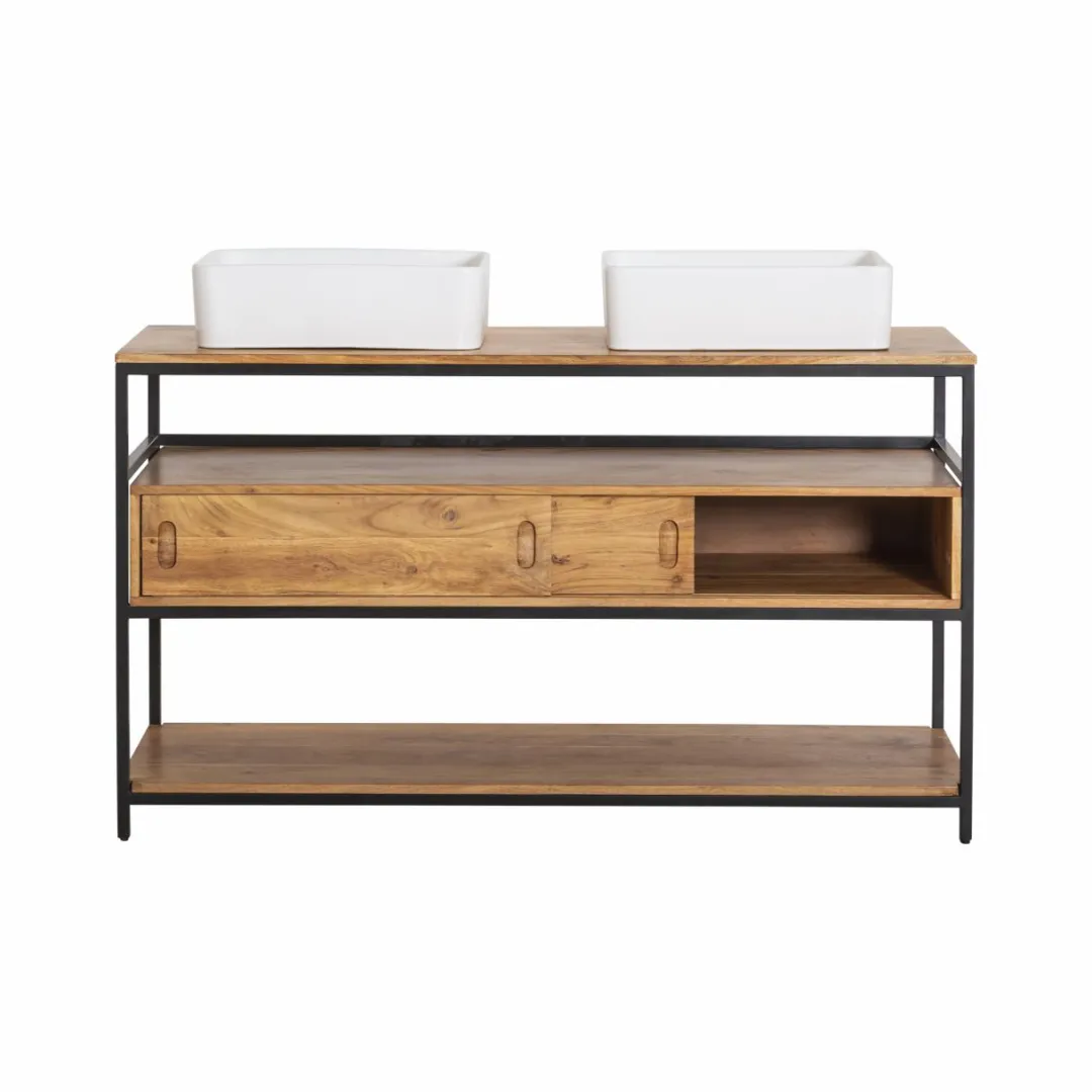 Côté conception : On est sur 80% bois, 20% métal. Un équilibre parfaitement dosé pour les personnes voulant s’essayer doucement à la tendance industrielle. Le bois d’acacia est une valeur sûre pour la salle de bain, il résiste très bien aux variations de température.