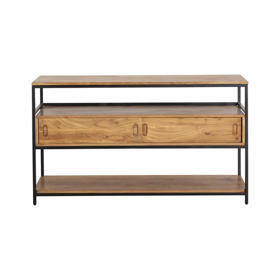 Côté pratique : Sur les 3 plateaux, n’hésitez pas à placer des petits paniers en osier ou en métal pour organiser votre rangement, c’est beau et c’est pratique. Au centre, petit bonus pour l’espace de rangement qui est caché par deux portes coulissantes, stylé pas vrai ?