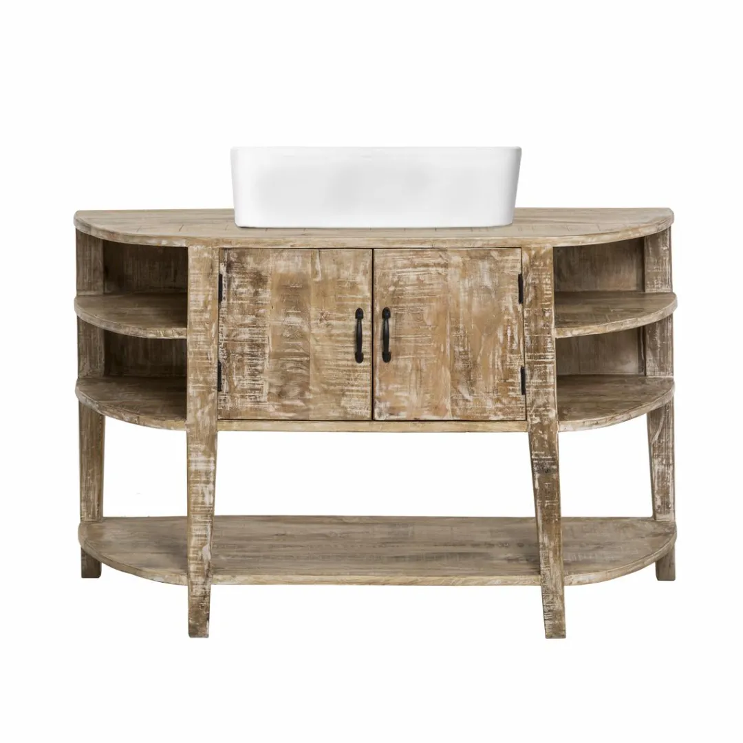 Ce meuble de salle de bain ancien saura satisfaire les petits comme les grands espaces en proposant des dimensions avantageuses et de nombreuses possibilités de rangements. Le bois de manguier a été blanchi afin d’apporter un aspect vieilli à ce meuble ce qui lui confère un charme fou ! On aime beaucoup son design simple et épuré qui amènera une touche de légèreté dans votre pièce.
