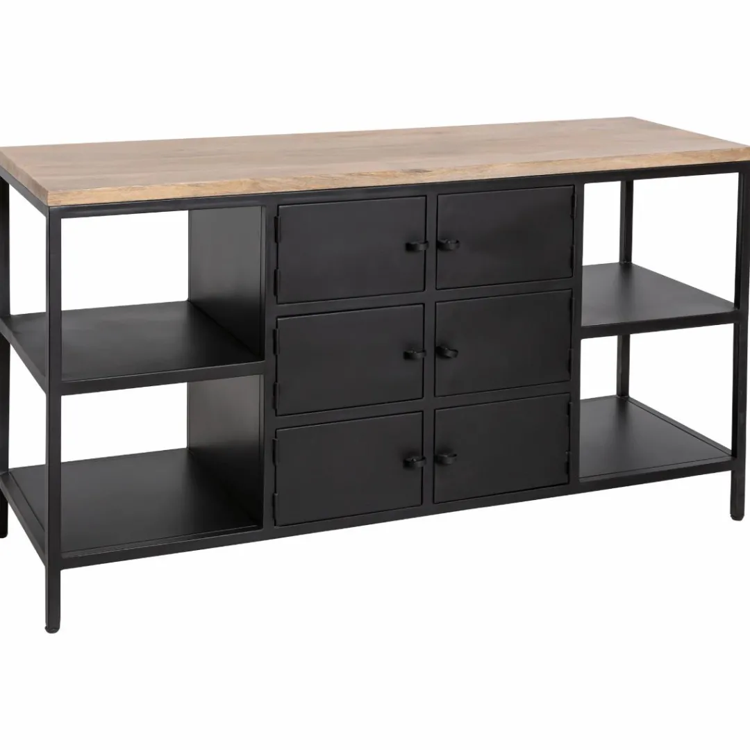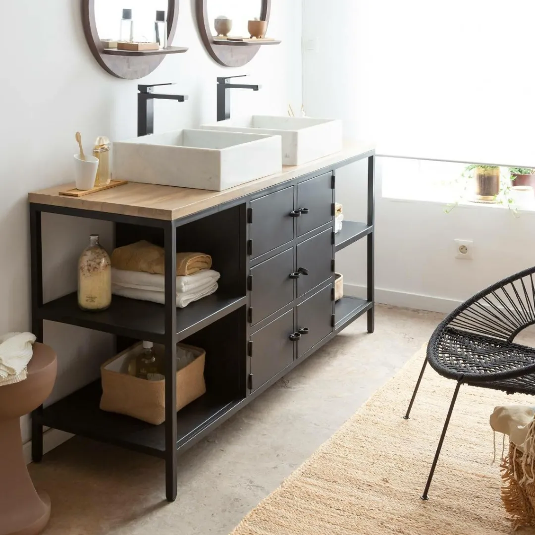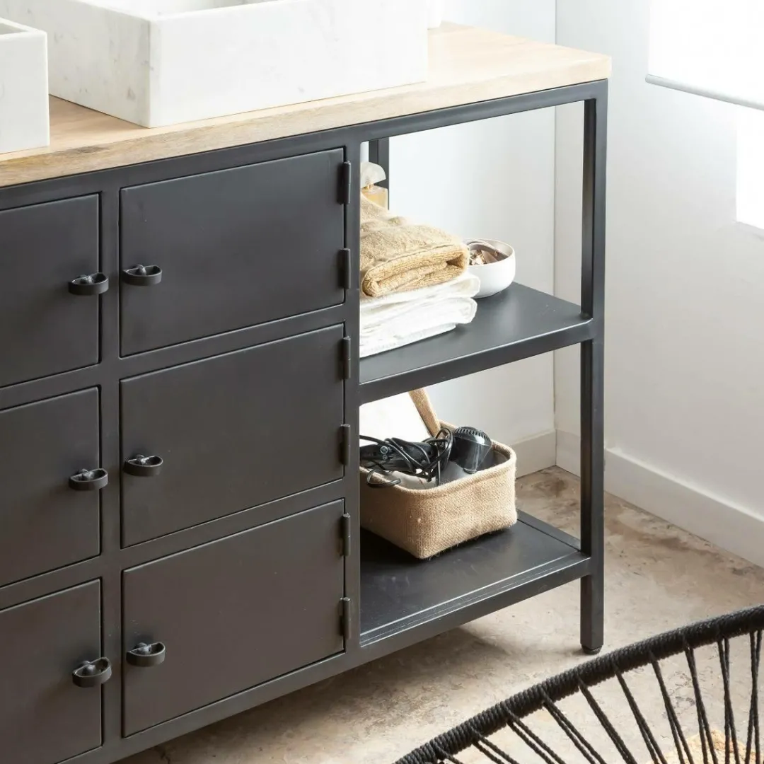 Boosté par un style propre à lui-même, ce meuble de salle de bain est porté par l’omniprésence de son métal. Ce matériau brut ajoutera une note de caractère à votre déco. On aime l’aspect lumineux de son plateau en manguier qui permet d’adoucir les traits de l’ensemble du meuble.