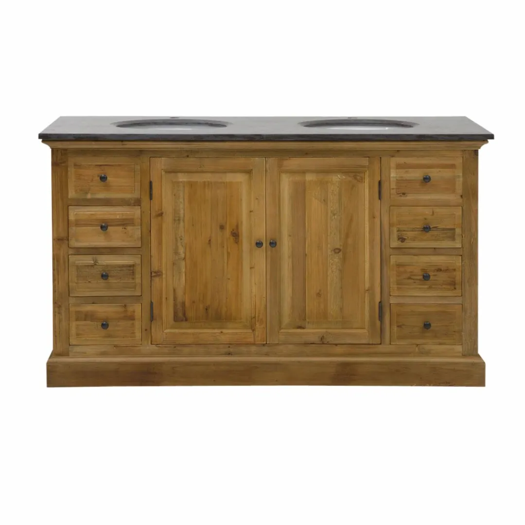 Ce meuble salle de bain bois massif est à la fois pratique et élégant. Il saura apporter à votre salle de bain un certain charme grâce à l’alliance du pin recyclé et de la pierre bleue de Chine. Ce meuble pourra facilement s’adapter à une salle de bain moderne ou classique grâce à sa finition naturelle.