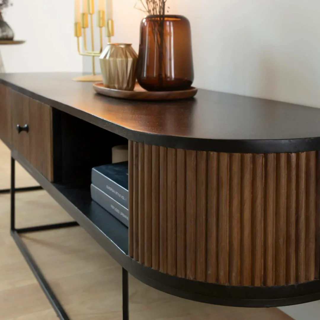 Bienvenue dans le monde du meuble TV Ysé. Cette pièce est la combinaison parfaite de codes classiques revisités. Fabriqué en bois de manguier et en métal noir, il adopte une approche contemporaine de la décoration intérieure qui plaira à tous les goûts et à tous les styles.