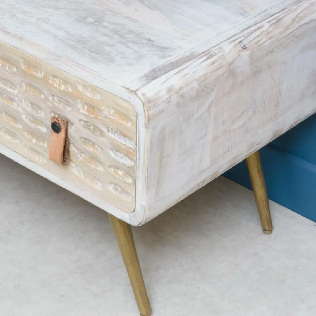 Créateur de coup de cœur, ce meuble tv est sans doute votre prochaine acquisition. Il habillera facilement et joliment un pan de mur grâce à sa silhouette élancée. Gros coup de cœur pour les lanières en cuir marron qui s’associent parfaitement aux nuances blanchies.