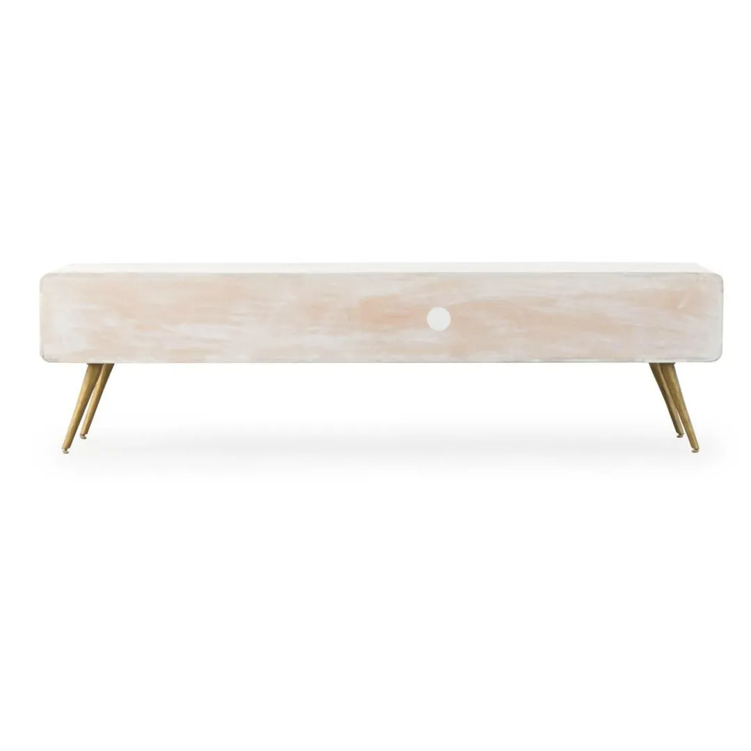 Son plus grand atout ; sans hésiter, son design. Ce meuble tv bois massif monopolise l’attention grâce aux nuances dorées et au motif original qu’on retrouve sur les façades de portes. Cette petite touche d’originalité n’est pas seulement visible au regard, elle l’est également au toucher car les façades de portes ne sont pas lisses, on sent une ondulation fidèle aux motifs creusés. Son piétement compas est largement mis en valeur et apporte une touche de légèreté au meuble. Très élancé, il est sublimé par le métal doré.