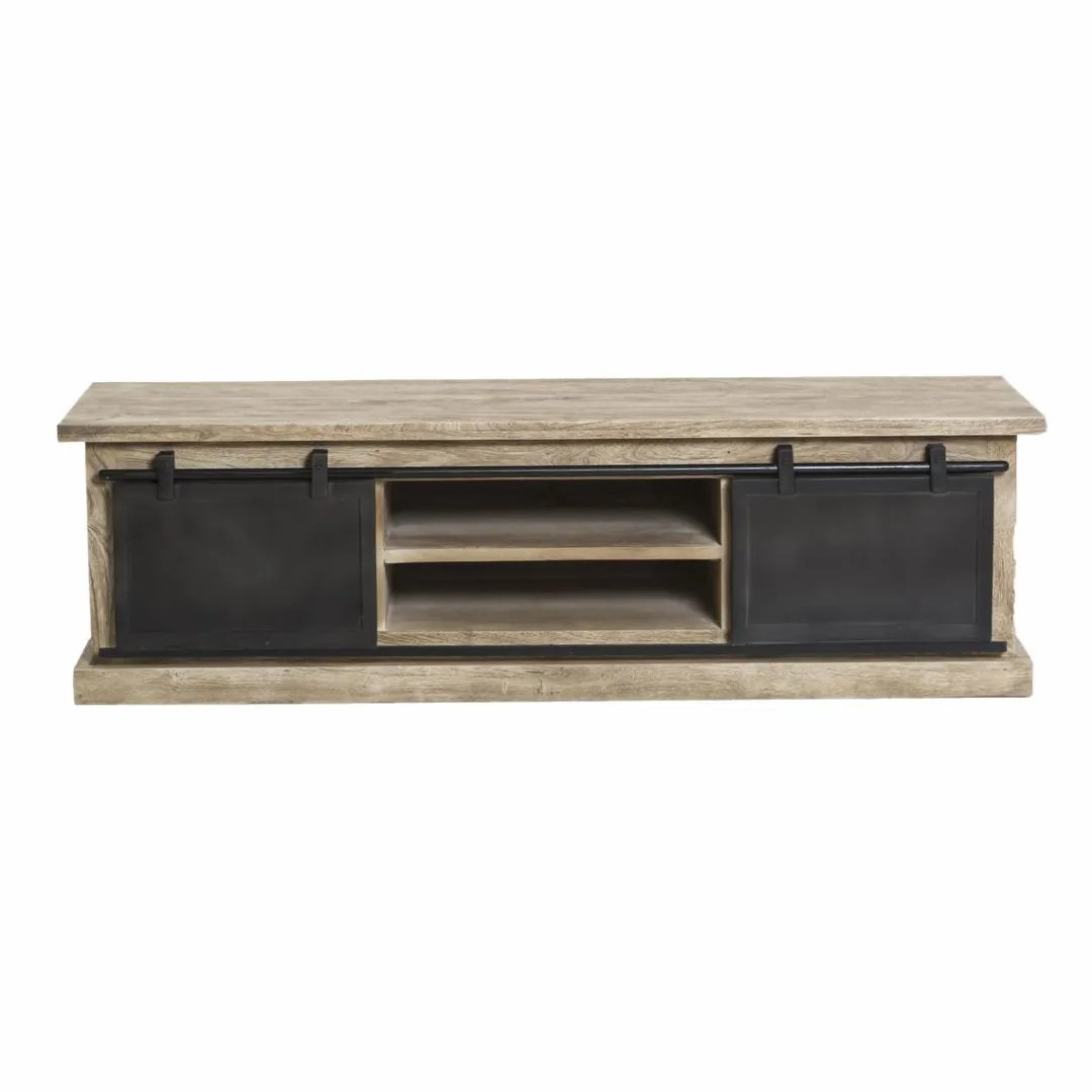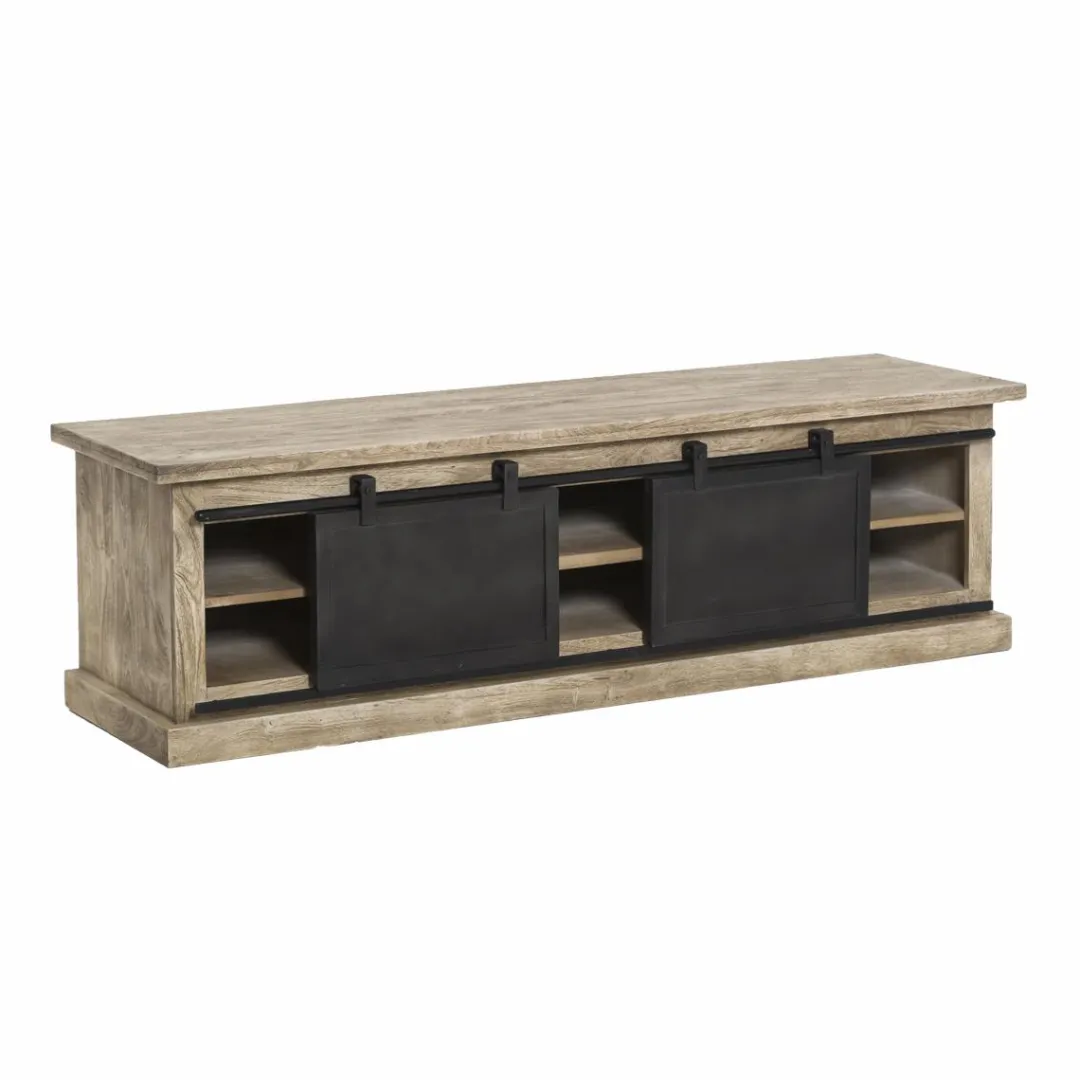 Son bois massif de manguier est très résistant. Il dispose d’une finition brossée, ce bois donne un aspect authentique et vintage au meuble. Le métal gris foncé souligne quant à lui les traits de ce meuble télé, mettant en valeur son design épuré.