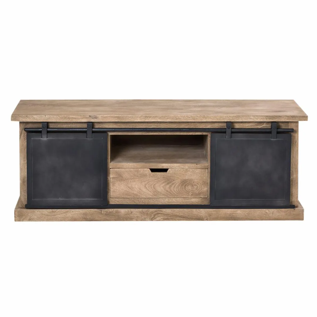 Son bois massif de manguier est très résistant. Il dispose d’une finition brossée, ce bois donne un aspect authentique et vintage au meuble. Le métal noir souligne quant à lui les traits de ce meuble télé, mettant en valeur son design épuré.