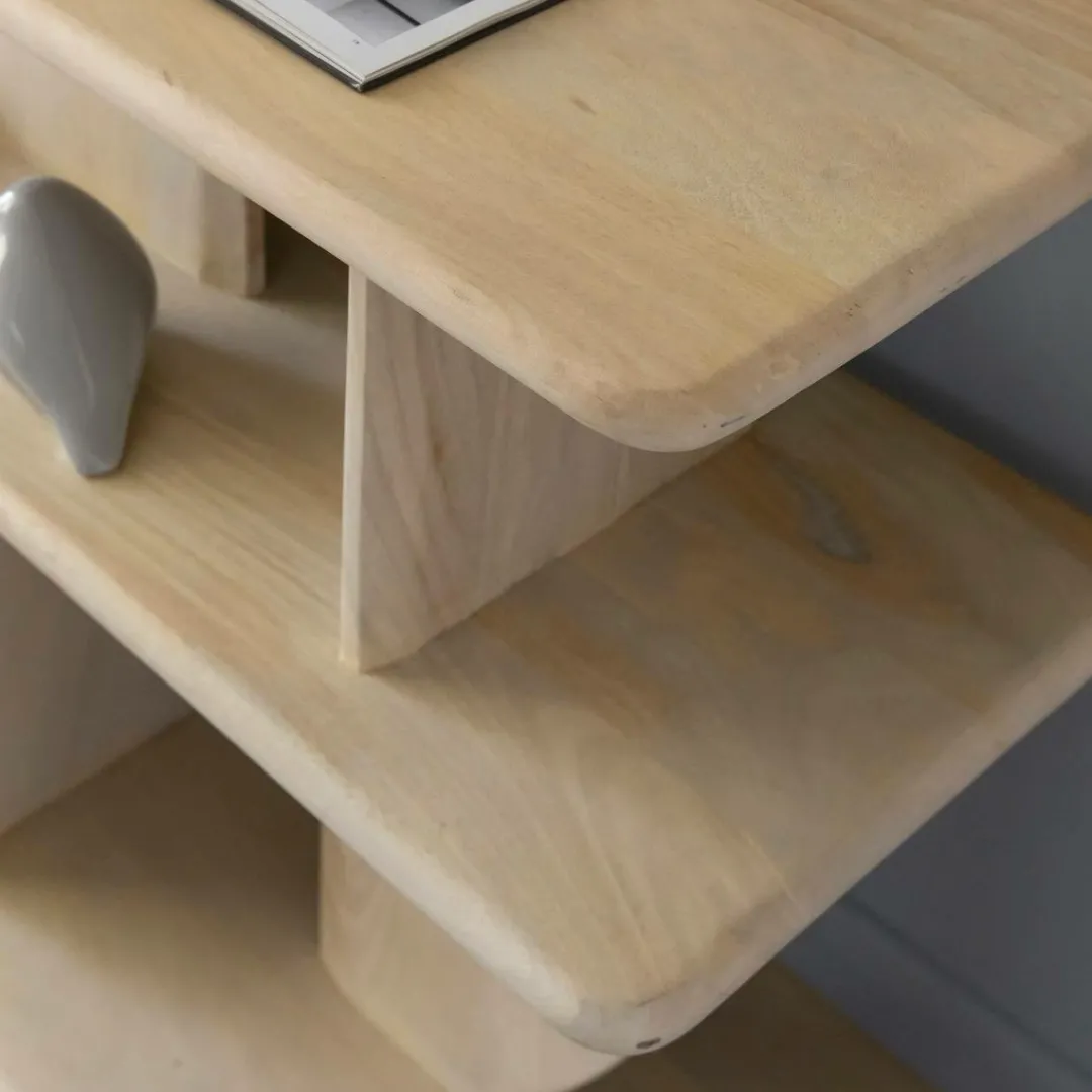 Ce meuble TV séduit par son design original et graphique, entièrement réalisé en bois de manguier massif. Cette essence exotique, réputée pour sa robustesse et son veinage unique, apporte une touche chaleureuse et authentique à votre intérieur. Ses lignes géométriques et ses séparations arrondies lui donnent une allure contemporaine et audacieuse, idéale pour un salon moderne.