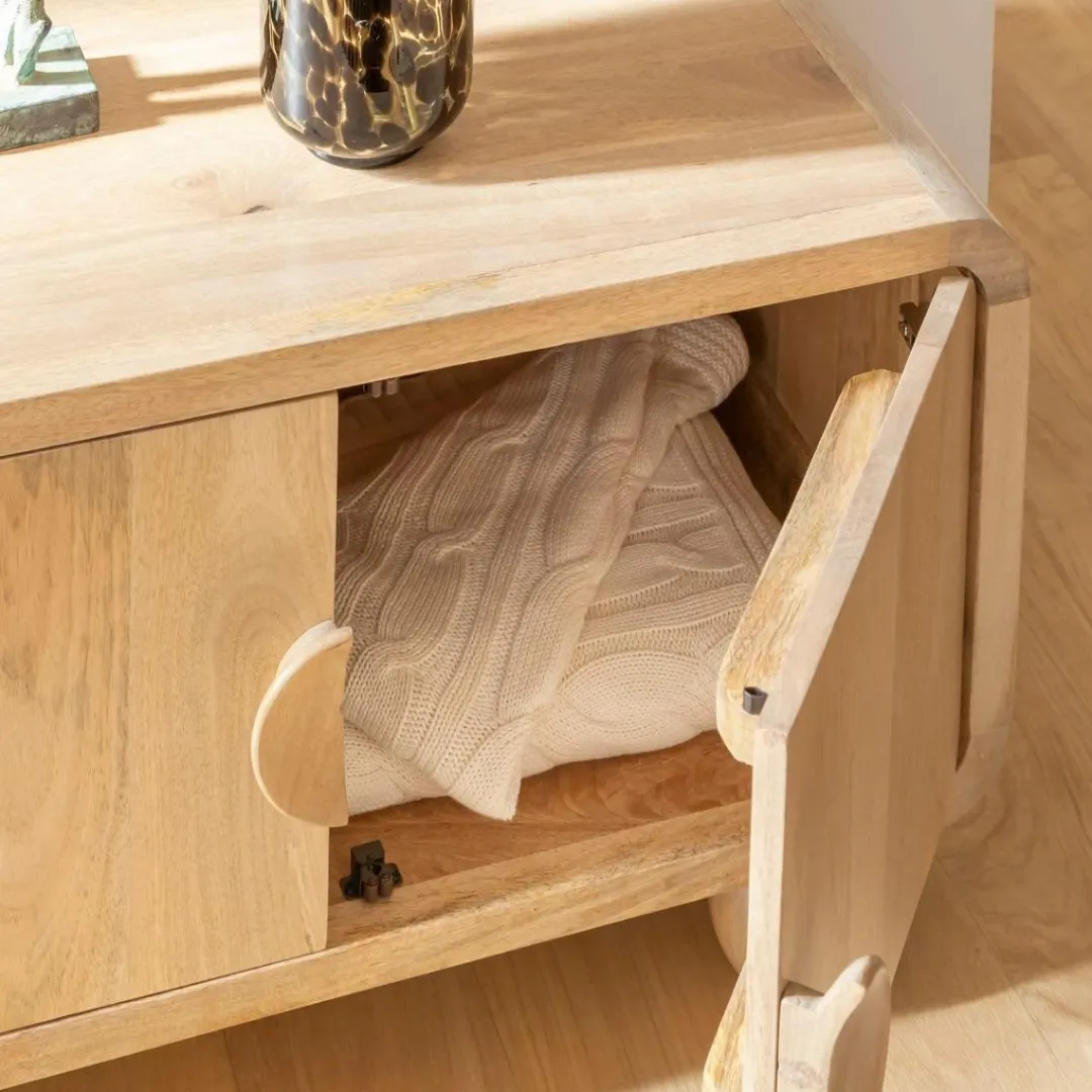 Nous comprenons l’importance de l’investissement que vous faites, alors soyez rassuré en sachant que cette étagère TV en bois est conçue pour durer. La couleur et la texture du bois se reflètent subtilement dans le matériau en bois de manguier ; chaque motif chaud et naturel est unique dans sa forme et son pigment, offrant la combinaison parfaite de la beauté et de la force tout en un. Invitez vos amis pour passer un bon moment ou installez-vous confortablement avec l’être aimé sur le canapé. Dans tous les cas, ne doutez pas que cette étagère TV en bois de manguier est aussi solide qu’elle en a l’air !