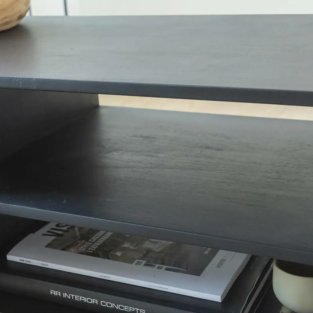 Ce meuble TV bois massif est constitué d’une structure en bois de manguier teinté et d’un piètement en métal noir. Grâce à sa couleur dominante, nous l’imaginons très bien dans une ambiance claire et épurée afin de venir casser ce climat. Son petit plus ? Ses poignées en métal de couleur laiton qui amène une belle touche chic au meuble. Il dispose d’un joli motif linéaire en relief, à la fois horizontal et vertical, qui vient ajouter du dynamisme à l’ensemble de ce meuble TV. Son design scandinave vous permettra d’obtenir une décoration au top de la tendance.