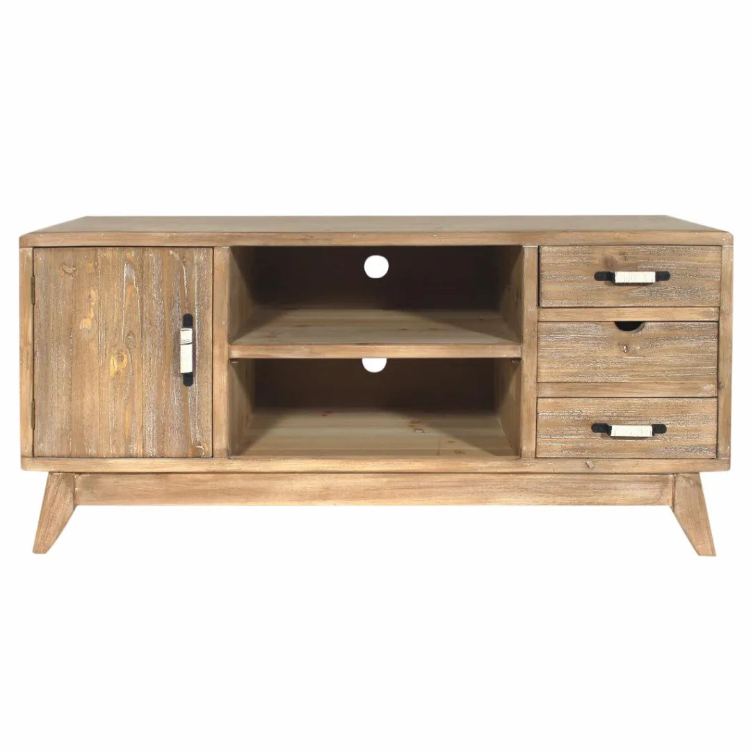Conçu en MDF et bois massif, ce meuble dispose d’une patine bois brossé qui lui offre des nuances claires. Doté d’une porte, deux niches et de trois tiroirs, ce meuble tv est très fonctionnel. Les niches ouvertes disposent de deux passes câbles qui faciliteront votre quotidien. Ces niches vous permettront de disposer vos lecteurs et consoles tandis que ses trois tiroirs accueilleront vos bouquins, DVD et télécommandes. Vous profiterez également d’un espace de rangement non négligeable grâce à sa porte. Semblable à un meuble tv bois massif, il vous accompagnera durant de longues années.