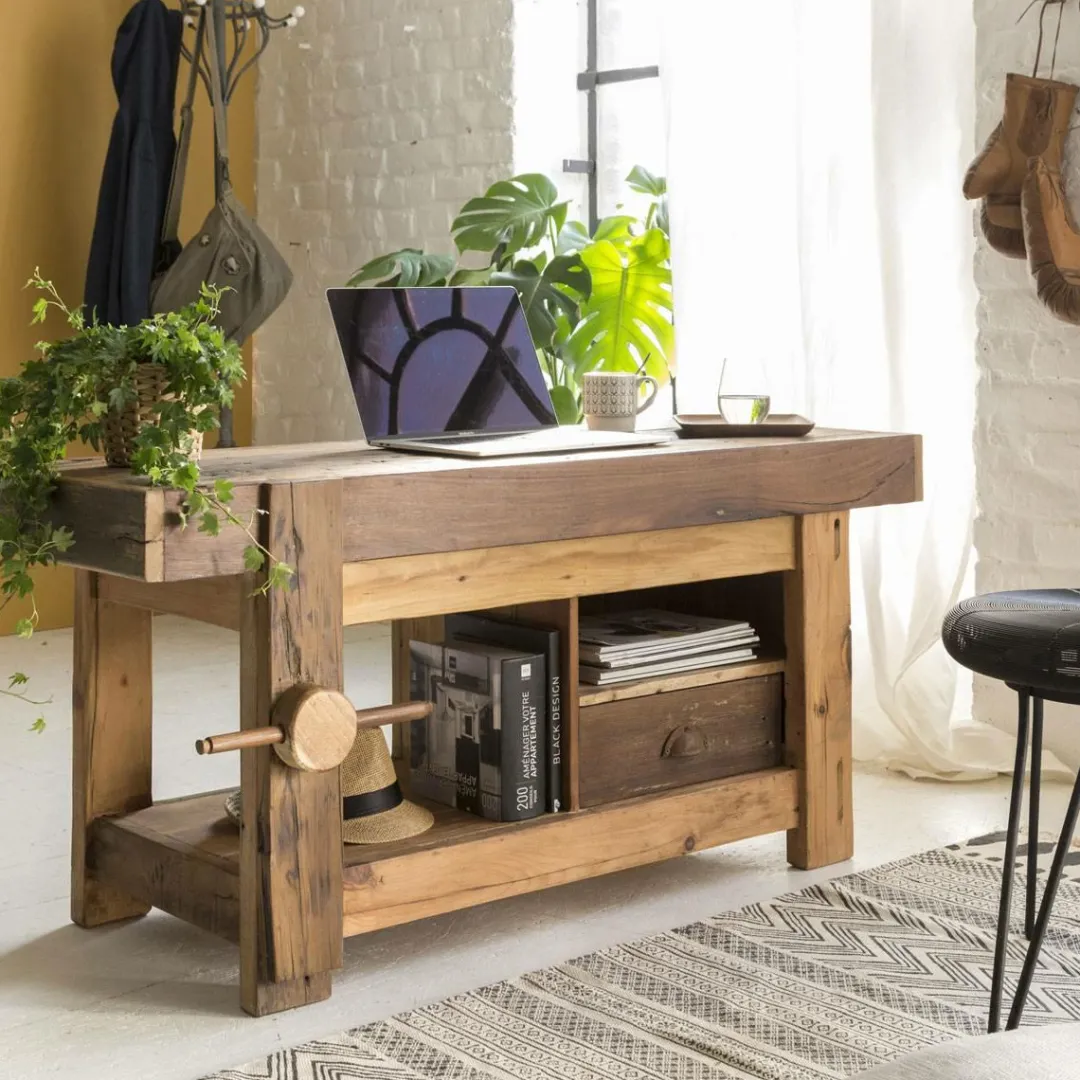 Du brut, du vintage, du cachet, tous les critères sont réunis pour que vous soyez conquis par ce meuble TV. Amateurs d’authenticité ? Cette pièce est sans aucun doute faite pour vous ! Son design est entièrement inspiré des établis d’antan et son aspect naturel se reflète grâce à ses imperfections et irrégularités.