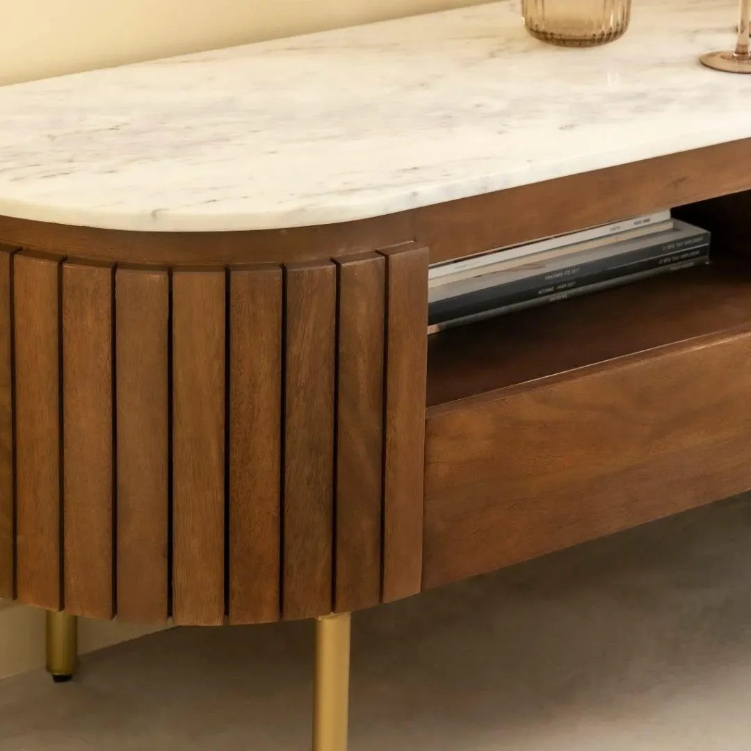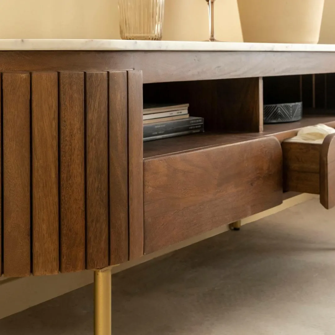 Le meuble TV Sienne est une pièce élégante et fonctionnelle qui apportera du caractère à votre espace de vie. Conçu en bois de manguier massif, il séduit par son design raffiné et ses finitions soignées. Son plateau en marbre blanc contraste harmonieusement avec la chaleur du bois, tandis que ses pieds en métal doré ajoutent une touche de sophistication.
